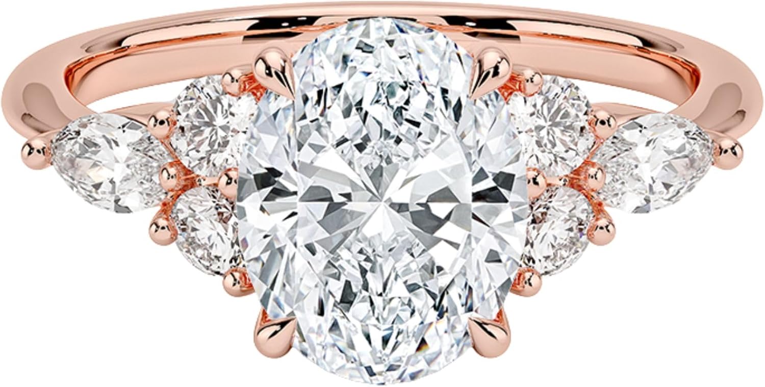 Mani stone Type: Moissanite diamond Shape: Oval Min. carat total weight: 1-5 Carat Accent stones Type: Moissanite diamond Shape: Round Number: 4 Min. carat total weight: 0.22 Setting: Prong Set Average Color: F/G Average Clarity: SI Type: Moissanite diamond Shape: Marquise Number: 2 Min. carat total weight: 0.20 Average Color: F/G Average Clarity: SI Ring Information Width: 1.7 mm Setting: Claw Prong