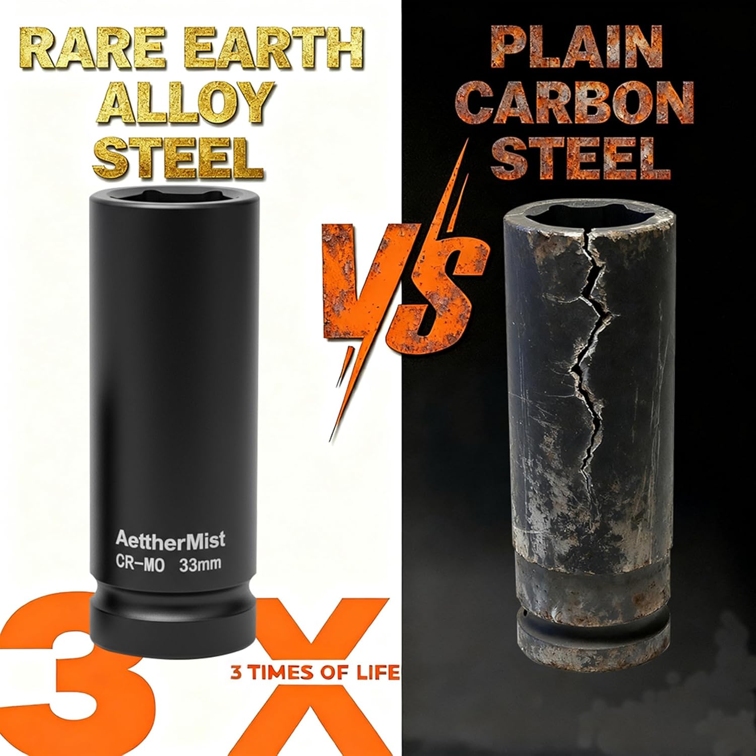 1 Inch Driver 33mm Extra Deep Impact Socket,with a total length of 200mm, it is made of impact resistant 42CrMo steel and has undergone comprehensive heat treatment to achieve a perfect balance between hardness and toughness, making it the best choice for high-strength bolts and nuts. Compliant with the design standards of the American Society of Mechanical Engineers and heavy vehicle tool standards.