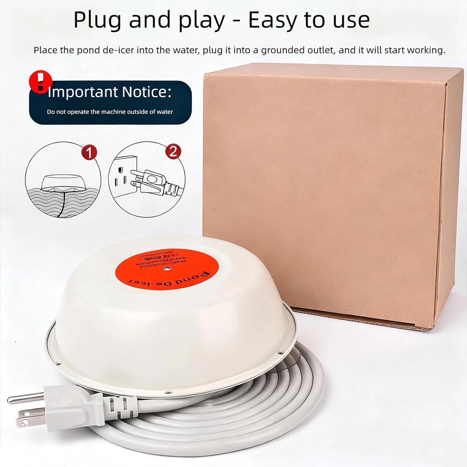 Energy-Efficient Thermostat: Our smart pond heater automatically activates below 41°F and shuts off over 131°F, optimizing power savings for small pond heaters and kois pond heaters while maintaining oxygen exchange with minimal energy use.High-Power Performance: With 1000W output, this stock tank heater rapidly thaws ice in outdoor ponds, doubling coverage for fish ponds and troughs in harsh winters, ensuring dependable heating for ponds up to 500 gallons.Fish-Safe Operations: Designed as a floating pond heater for outdoor ponds with fish, it creates safe ice-free zones without harming aquatic life, making it ideal for kois ponds, saltwater setups, and livestock drinking troughs.Robust Durability: Built from rust-proof cast aluminum, this pond heater for winter withstands extreme weather, providing even heat distribution and long-lasting use for bird bath heaters and solar pond heaters in all climates.Robust Durability: Built from rust-proof cast aluminum, this pond heater for winter withstands extreme weather, providing even heat distribution and long-lasting use for bird bath heaters and solar pond heaters in all climates.Specifications: Product Dimensions: 7.2 x 2.6 x 2.6 inchesItem Weight: 1.83 poundsPower: 500wPower cord length: 10 feetPracticality: Suitable for outdoor ponds, fish ponds and other water environments, or animal drinking troughs, to avoid freezing in winter and supports the surviva
