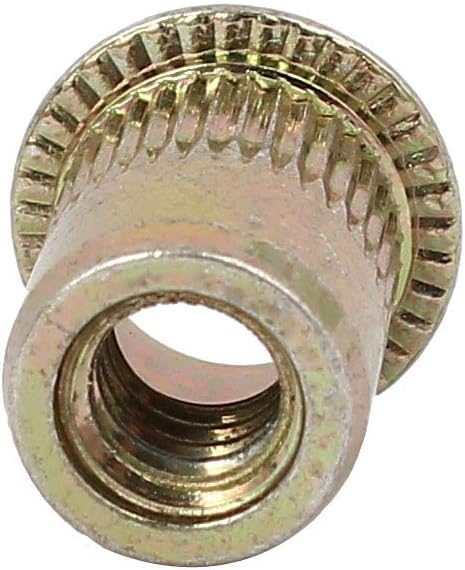 Aexit 1/4" x 9.8mm x 15mm Straight Knurled Umbrella Head Round Rivet Nuts 500 Pcs (95cbde56cfeb1062fc8f612ec65002be)This nutser_t has a large flange to provide increased strength in punched and drilled holes.Knurled body provides a higher resistance to spin out when installed in soft materials.Rivet Nut fastener is a tubular rivet with internal threads.It can be installed in seconds form one side of the work.Description in French1/4"x9,8mm x 15mm ronde tête parapluie moleté droit écrous rivet 500 pcsTaille du filetage~Dia~1/10,2cm~nom du produit~rivet écrouMatériau~métal~poids~2080gContenu de lemballage~500(+/-2%) x rivet écrou~couleur principale~bronze ToneHauteur~15mm/1,5cm~bride taille~13x 1mm/1,4x 0,1cm (D * T)La taille du trou dapplication~Dia~8mm/0,8cm~diamètre du corps.: 9,8mm/1cm