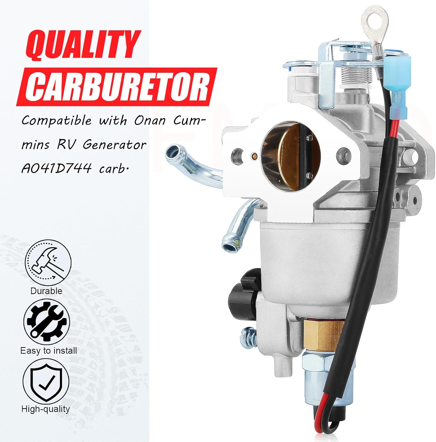 Features: New high-quality carburetor kit. Material: alloy. Replaces part number: 146-0881. Manufactured to exact measurements to meet or exceed OEM specification. With mount parts as picture, match up exactly with original equipment in perfect fitness. Compatible with: For Onan Cummins RV Generator A041D744 carb. For Onan QG 4000 4KYFA-6747P model. For Cummins 0A6562 KY Series Generator. Please be carefully check the goods appearance, size, shape before ordering. Package included: 1 x carburetor. 1 x carburetor cleaning brush. 3 x mounting gaskets. 1 x fuel shut off valve. 2 x fuel filters. 2 x fuel lines. 10 x clamps.