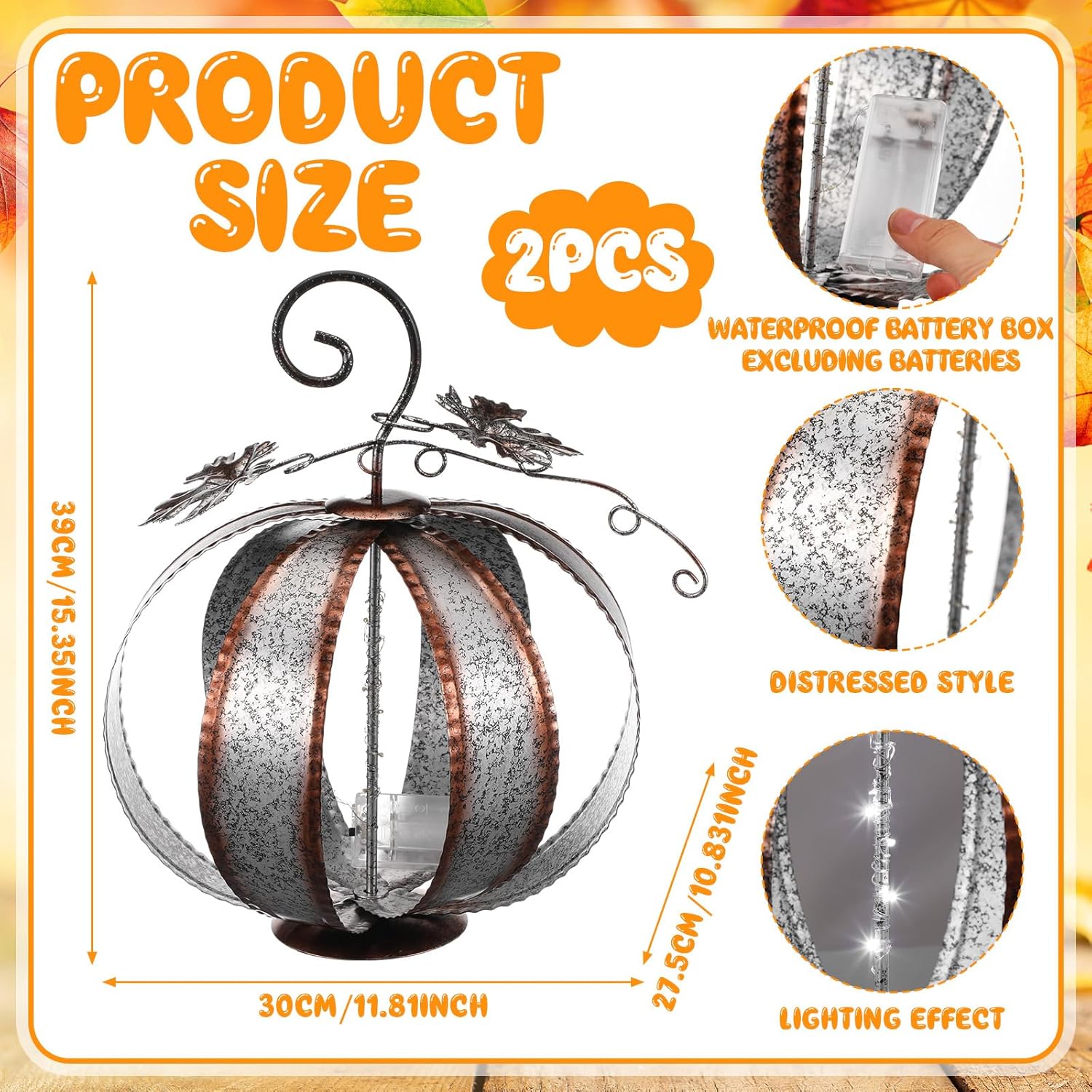 Features: Festive Thanksgiving Ambiance: Enhance your home with a cheerful Thanksgiving vibe that celebrates the essence of the season. Our pumpkins bring warmth and joy, making them a delightful addition to your festive decor for holidays and gatherings. Easy to Set up: With a user-friendly design, setting up your autumn decorations is a breeze. Simply unfold the pumpkins and place them wherever you want to create an enchanting Thanksgiving atmosphere, welcoming friends and family into a cozy and joyful environment. Specifications: Material: metal Color: silver Size: 9.06 x 11.81 x 8.27 inches Package includes: 2 x Fall pumpkin decorations Notes: Manual measurement, please allow slight errors on size. The color may exist a slight difference due to different screen displays. The battery life is related to the frequency and length of use of the product. If the frequency of use is high, and one-time use long, the battery life will be relatively short