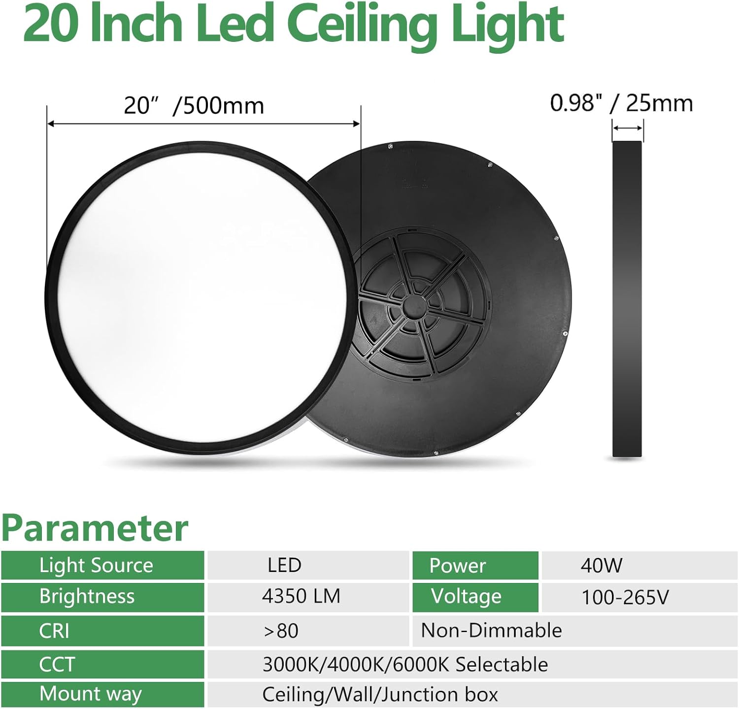 20Inch 40W, 4350LM, 3000K/4000K/6000K CCT Selectable LED Flush Mount Ceiling LightThis ceiling light is integrated LED mount ceiling light, gives off higher brightness than the traditional incandescent bulb with less energy and electricity bill, and it is well sealed to prevent dust and flying objects from entering, provie great performs in wet conditions.Product Details:Light Source: LEDPower: 40WVoltage: 85-277VSize: Φ=20 inch, H = 1.06inchWaterProof level: IP42CRI: 80Color Temperature: 3000K/4000K/6000K CCT SelectableFeatures:1. 3000K/4000K/6000K CCT Selectable: You can set your favorite color directly on the light fixture before installation.DL : 6000K Daylight: cool white for the user who want bright color light, suitable for reading, writing. NW: 4000K Neutral White: provide middle level of the brightness.WW: 3000K Warm White : soft white color for user who want lower brightness but yellowness2. Slim Body: The height of this ceiling light is only 0.98 inch (2.5 cm), really thin & slim & close to flush mount, make this ceiling light ideal for low profile space.3. Well sealed integrated LED mount ceiling light: This is a ceiling light with good sealing and moisture-proof performance, and mechanized production to ensure high quality. Each light is well sealed and to prevent the entry of dust and water mist, can provide great performance in wet conditions.4. Enjoy true color: The light of this led ceiling light is 80+CRI, provide better color rendition, and bring you a better visual experience.