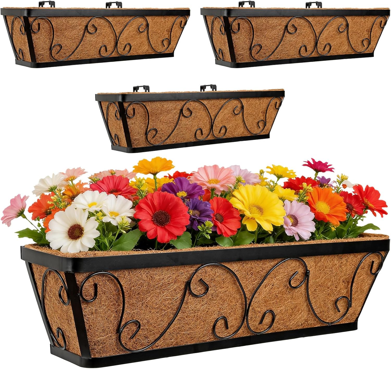 Elevate your exterior styling with the sleek, contemporary appeal of our 2-pack crisscross hanging planter boxes. This window boxes set embraces a striking geometric lattice design that perfectly complements modern architecture, urban balconies, and minimalist garden landscapes. Whether you are planting a vibrant display of cascading geraniums or cultivating a functional mini herb garden just outside your kitchen window, these balcony planters frame your greenery with clean, sophisticated lines. Durability and structural integrity are built into every inch of these deck railing planter boxes. The robust iron framework is meticulously treated with a high-grade rustproof finish, ensuring that your vibrant floral displays are supported by metalwork that refuses to weather, chip, or degrade over time. To ensure your beautiful porch railing planter stays exactly where you put them, we have included an innovative set of mounting brackets. Featuring a unique dual-assembly design, the hardware effortlessly adjusts to accommodate varying railing widths, providing a custom, anti-wobble fit on virtually any balcony or porch. We know that great fence planter box must function as beautifully as they look. Inside the spacious 24-inch length, 7-inch width, and 6.6-inch height, a premium coco coir liner sits ready to nourish your plants. This tightly woven natural fiber acts as a superior drainage system, preventing root rot while simultaneously locking in the moisture necessary for healthy, vigorous growth. This 2-pack window flower boxes outdoor set offers an immediate, elegant solution for homeowners looking to reclaim their floor space and bring their gardening ambitions up to eye level.