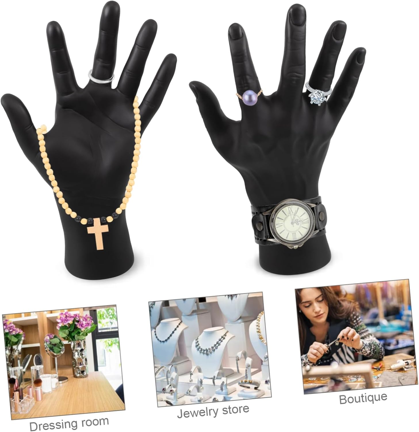 DescriptionIdeal for jewelry stores, exhibitions, and personal collections, this male hand mannequin prop offers a stylish and practical for displaying rings, bracelets, and bangles. The realistic design and open- provide an eye-catching presentation, making it easier for customers to visualize how the jewelry will look when worn. Enhance your display with this sophisticated hand model.Features-Color:Black-Material:Plastic-Size: 28.00X17.00X6.00cm/11.00X6.68X2.36in -Distinctive design: the design of the male hand mannequin makes it a standout choice for jewelry displays-Highly realistic: this hand model is crafted to be highly realistic, adding a lifelike touch to your jewelry presentation-Open fingers: the open finger design allows for easy and versatile jewelry arrangement, accommodating various shapes and sizes-One pair set: includes left and right hand models, providing sufficient quantity for your display needs-Stable and elegant: the base design ensures the hand model remains stable and elegant, promoting the overall display