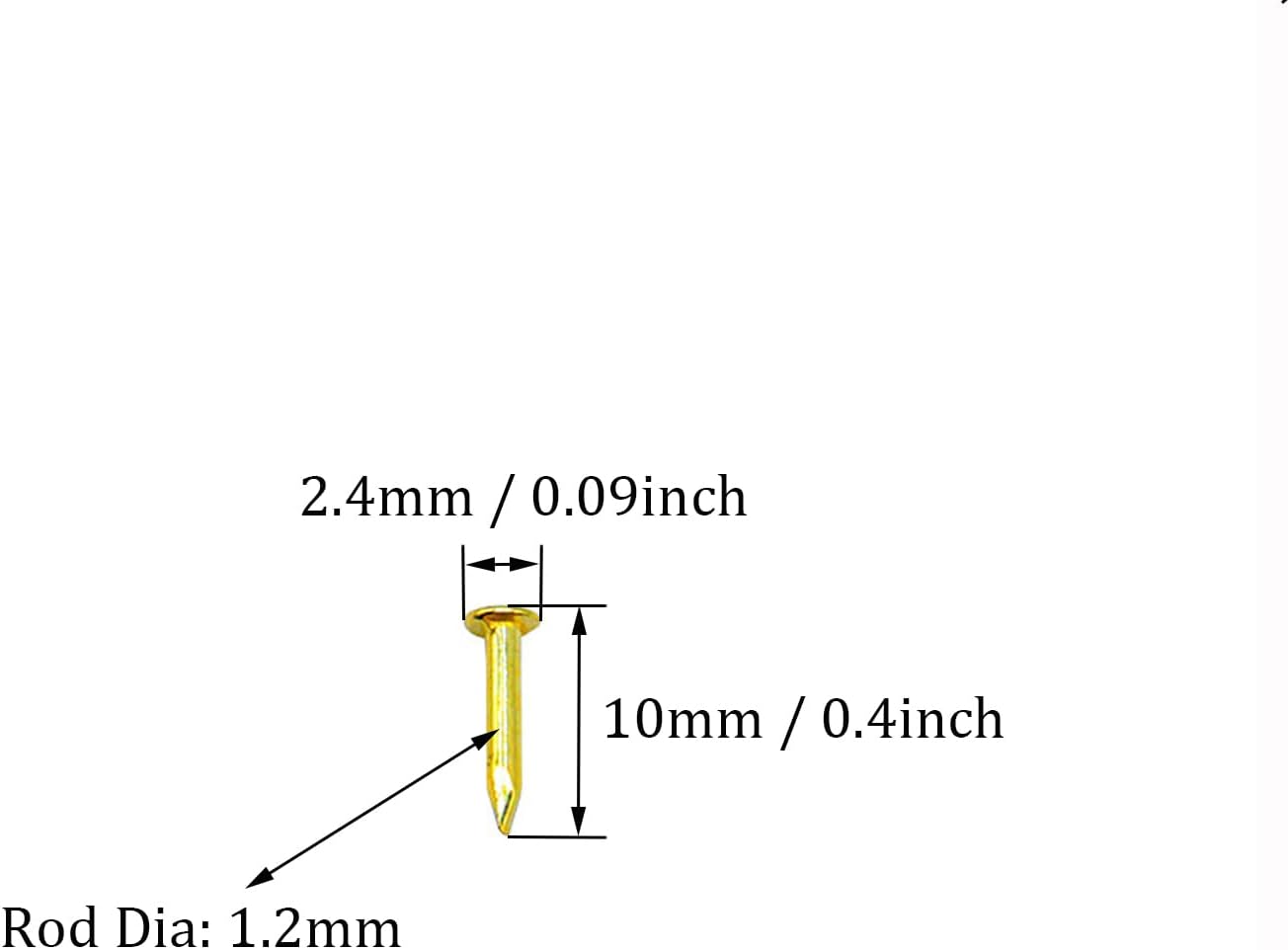 The nails are made of high-quality Iron,and copper plating surface treatment , which is high hardness, smooth and has strong penetrating power, can be easily inserted into the wood. Small nails are widely used in a wooden, wood table decoration, box making accessories,interior framing, carpentry, building boxes,Ideal for hanging photos, mirrors, and othe, decorations around the house, Also suitable for creating various DIY wooden crafts. Specifications Material: Iron Size: Total Length: 10mm / 0.4"; Rod Dia.: 1.2mm; Head Dia.: 2.4mm / 0.09" Color: Brass Tone Package Includes: 300pcs(+/-5%) x Small Tiny Nails