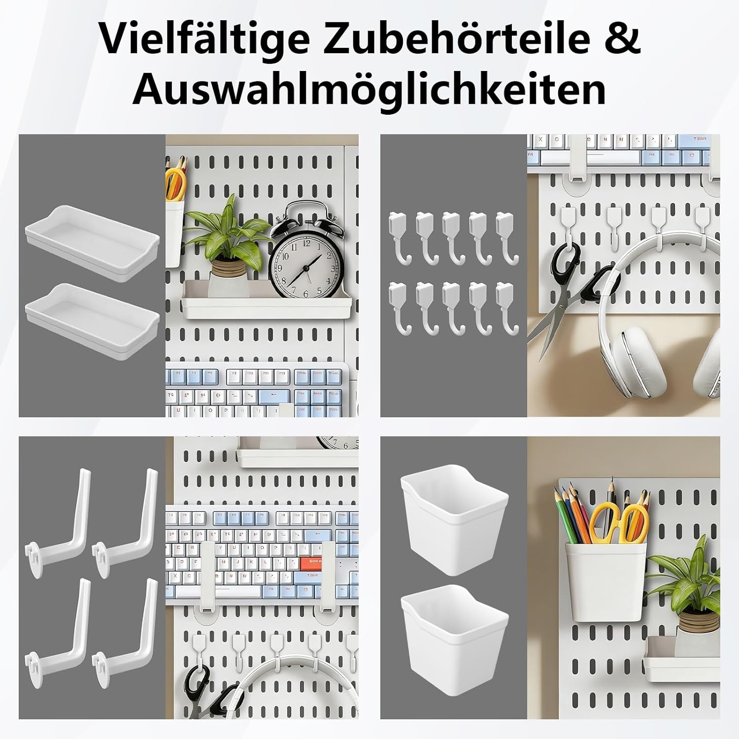 The Risirica Peg Board Organizer is crafted from premium thickened ABS plastic, boasting superior sturdiness, reliable load-bearing capacity, and easy maintenance with a simple wipe-clean design. Its flexible modular structure includes four panels that can be freely arranged into a custom-sized wall organizer, unlocking your organizational creativity and perfectly fitting spaces like offices, kitchens, and garages. This value-packed set comes as a complete 25-piece kit, featuring peg boards and assorted accessories to provide a tailored storage solution for office, kitchen, or gaming setups right away. Offering dual installation options, it supports tool-free mounting on smooth surfaces via strong adhesive Velcro or permanent fixation with screws, ensuring quick and versatile setup. More than just a storage tool, it serves as a space-saving system that transforms cluttered walls into efficient, stylish command centers, combining functionality with sleek design to maximize space utilization and productivity across any room.