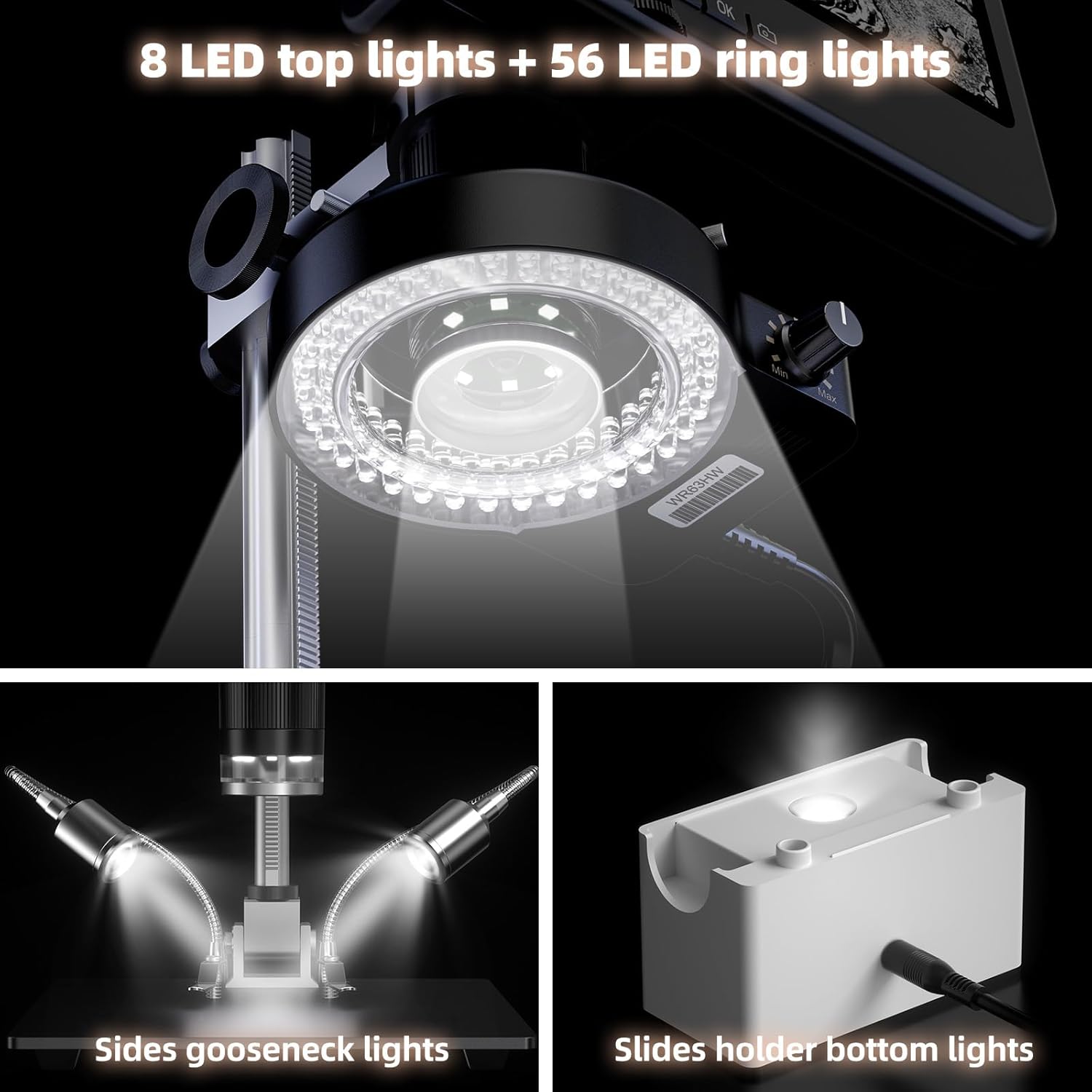 | BuiltIn Media | 64GB SD Card, Card reader, Cleaning cloth, User manual, Microscope monitor, Metal base,Column, External ring light, Power adapter, Power cable, HDMI cable, USB date cable, Prepared microscope slides x5, Slides holder, Metal clips x2 |