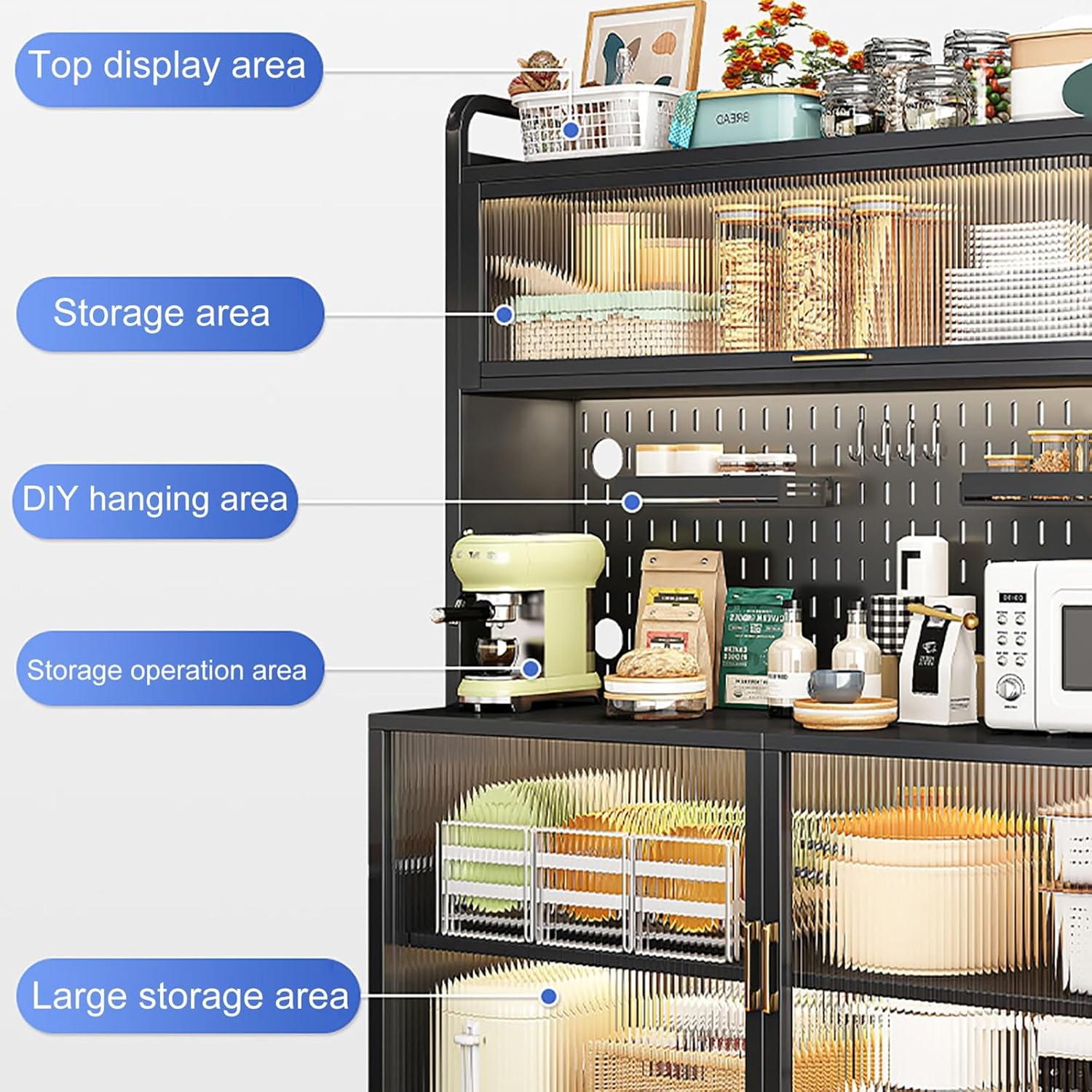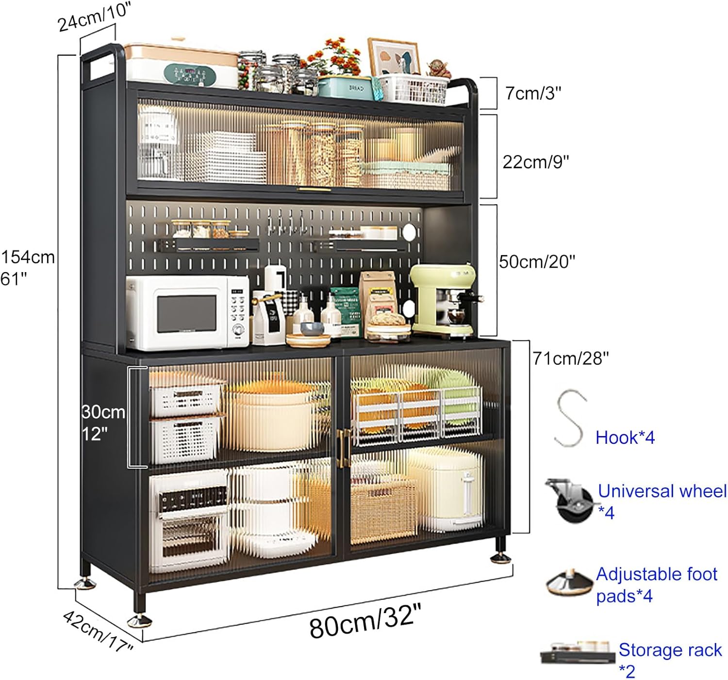 kitchen storage rack: Features: 1. Heightened feet, 9cm/4in from the ground, moisture-proof and easy to clean 2. Light luxury golden handle, easy and labor-saving opening and closing 3. With hanging holes to expand storage space 4. High guardrail 5cm/2in anti-fall design Product Details: Name: Kitchen storage rack Color: Black , White Material: Carbon steel Finish Type: Painted Max Load Capacity: Total 400kg / 880lb Assembly Required: Yes Uses For: kitchen, living room, kitchen, dining room, study, hallway Overall Size: 60x42x154cm/24x17x61in 70x42x154cm/28x17x61in 80x42x154cm/32x17x61in 100x42x154cm/40x17x61in Included Components : Kitchen baker's rack x 1 Universal wheels x 4 Practical tray x 2 Foot pad x 4 Hooks x 4 Caution: 1.The size of the product is measured manually, there may be an error of 0.2-0.4in, and the actual product shall prevail. 2. If you have any questions, please feel free to practice us, we will help you solve the problem as fast as possible.