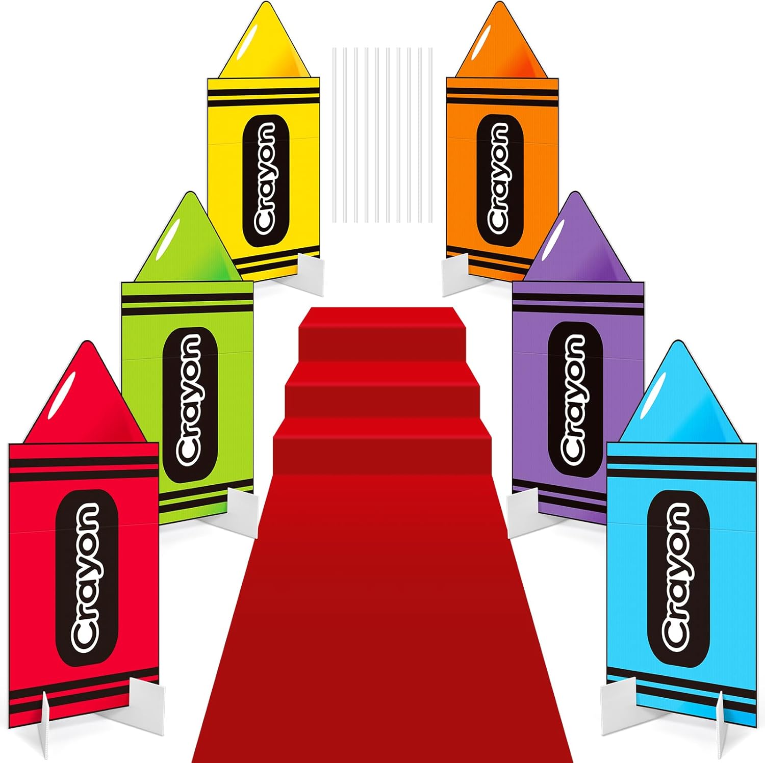 Features: Our special design makes your pencil theme parties stand out and becomes a distinctive focal point The pencil yard signs large enough for home, school, outdoor yard, garden backyards, party venues or walkway decor. Specifications: Material: Pencil sign: thickened corrugated hollow plastic board Runway carpet: polyester Color: rainbow Size: Pencil sign: about 24.8 x 15.75 inches/ 63 x 40 cm in total Package includes: 6 Sets of pencil sign 12 X 13.78 inches plastic short stakes 12 X 5.9 inches short stakes 6 x Hollow board bases 1 X 9.84ft Runway carpet 1 Roll of double-sided tape Notes: Manual measurement, please allow slight errors on size. The color may exist a slight difference due to different screen displays. Small parts included, please keep them away from little kids to avoid swallowing risk Small parts included, please keep them away from little kids to avoid swallowing risk