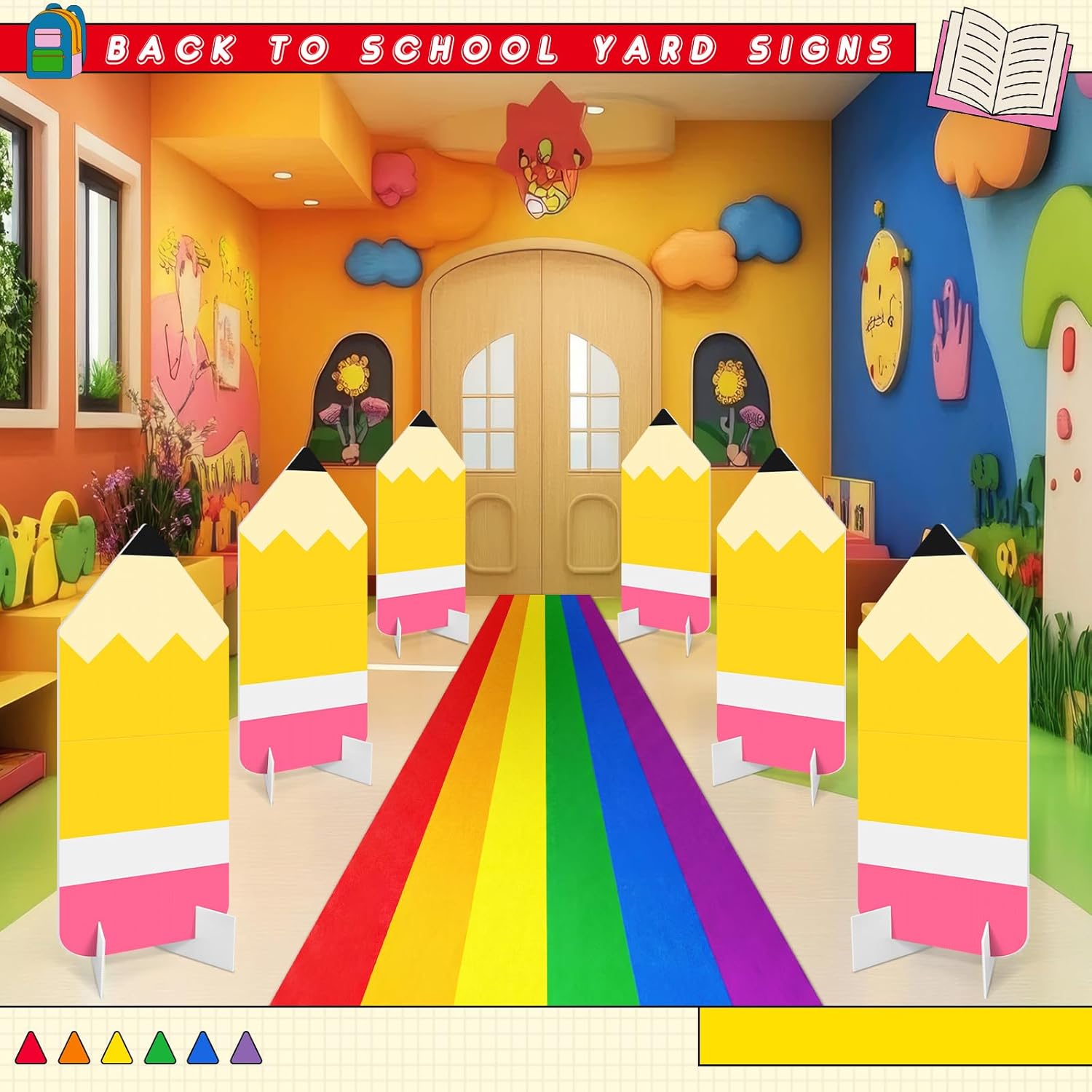 • Product Include: this set includes 6 large pencil-themed hollow board signs, each fully assembled to approximately 27.56 × 11.81 inches/ 70 × 30 cm; The package comes with a complete set of installation accessories: 12 plastic ground stakes (13.78 inches/35cm), 12 plastic connecting posts (5.91 inches/15cm), 6 hollow bases for indoor use, and 1 rainbow carpet rug measuring 118.11 inches/ 300 cm