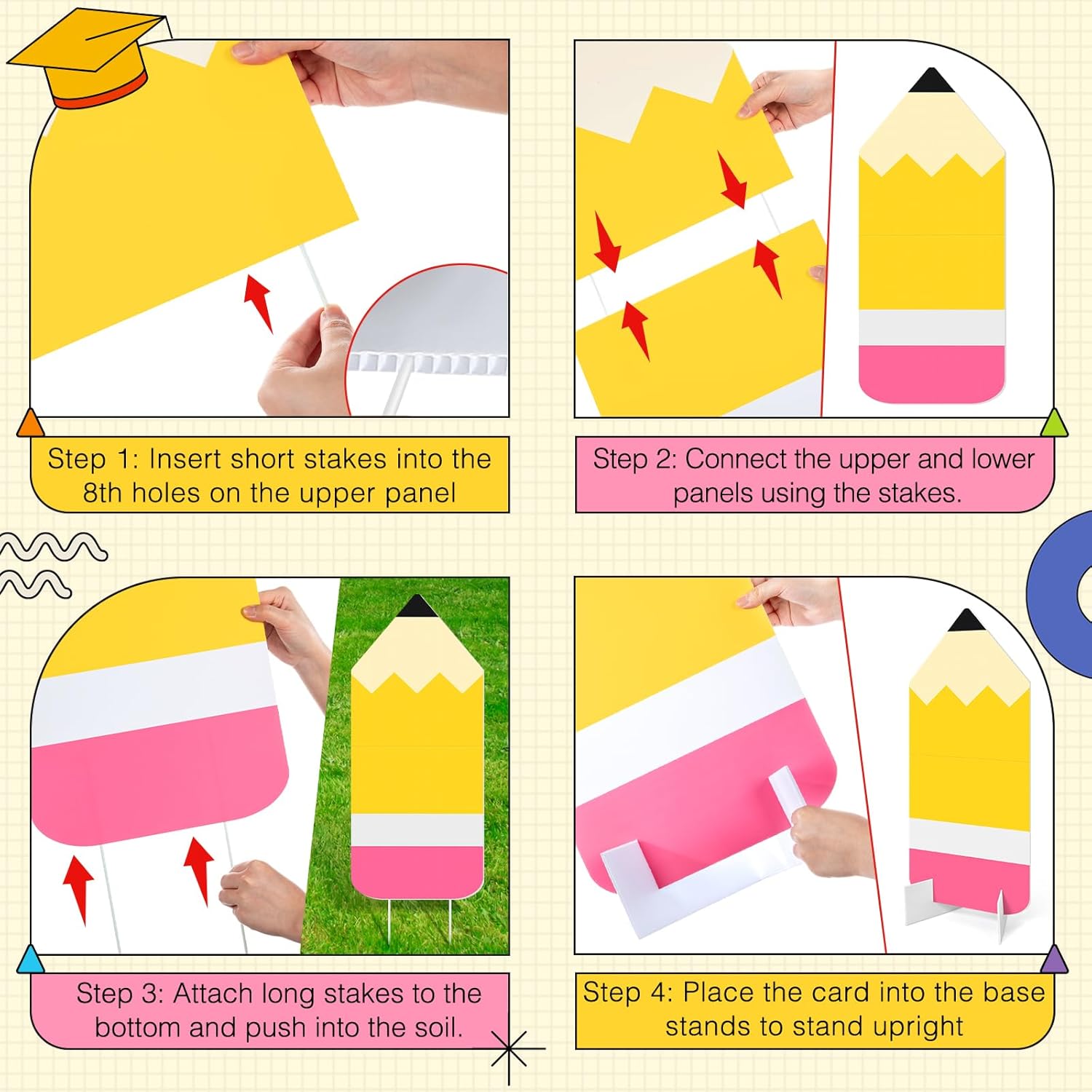 • Premium Material: Crafted from high-quality lightweight yet rigid PP hollow board, these crayon-themed decorations are easy to carry, assemble, and reposition, making them ideal for quick setup at school events. The PP material is waterproof and moisture-resistant, allowing for reliable outdoor lawn display, even in damp conditions, without easy warping or damage
