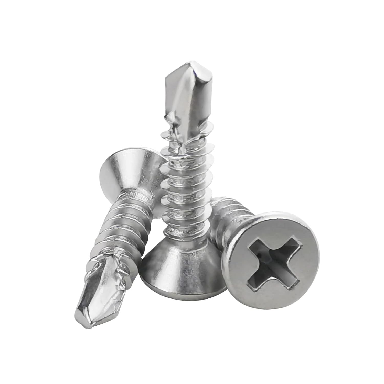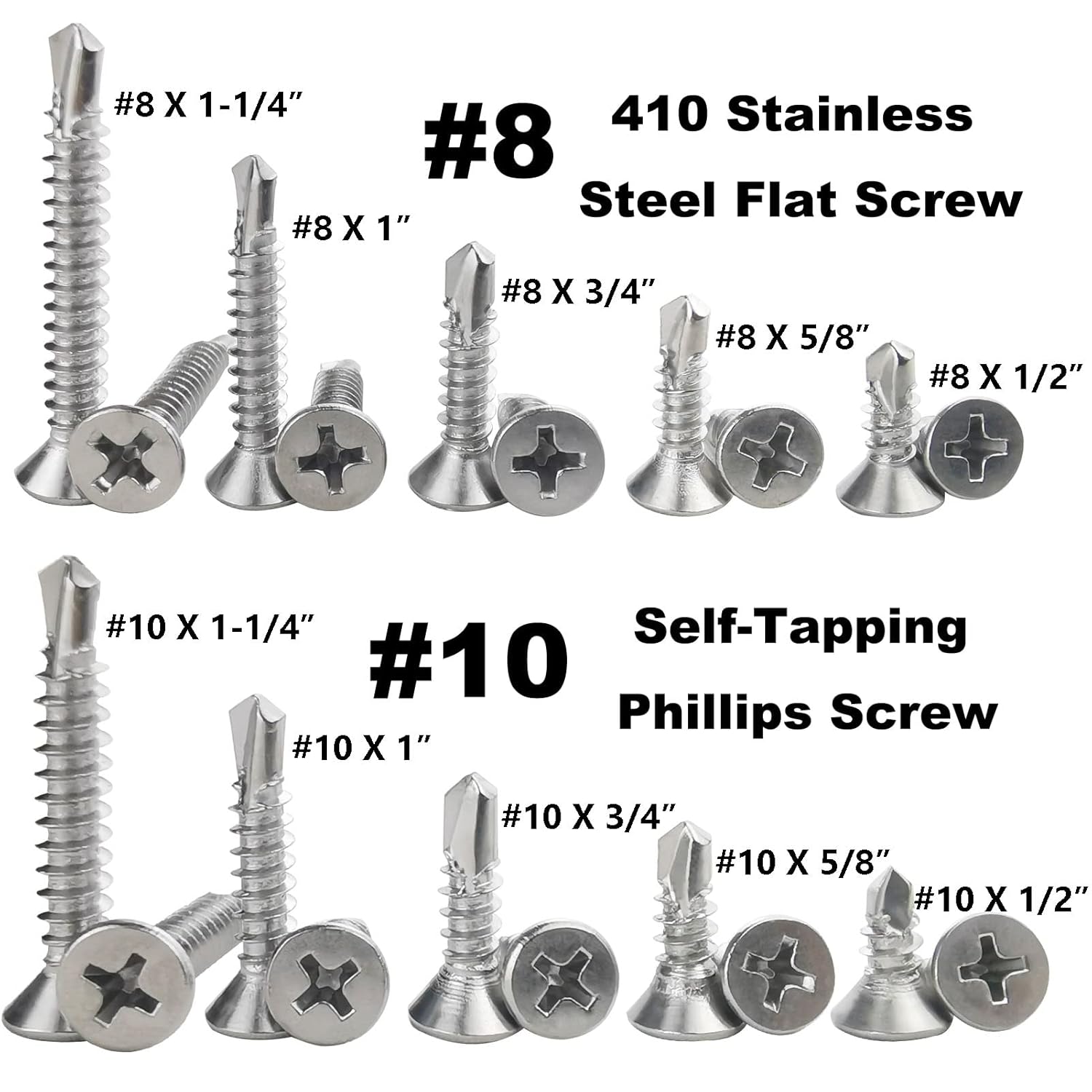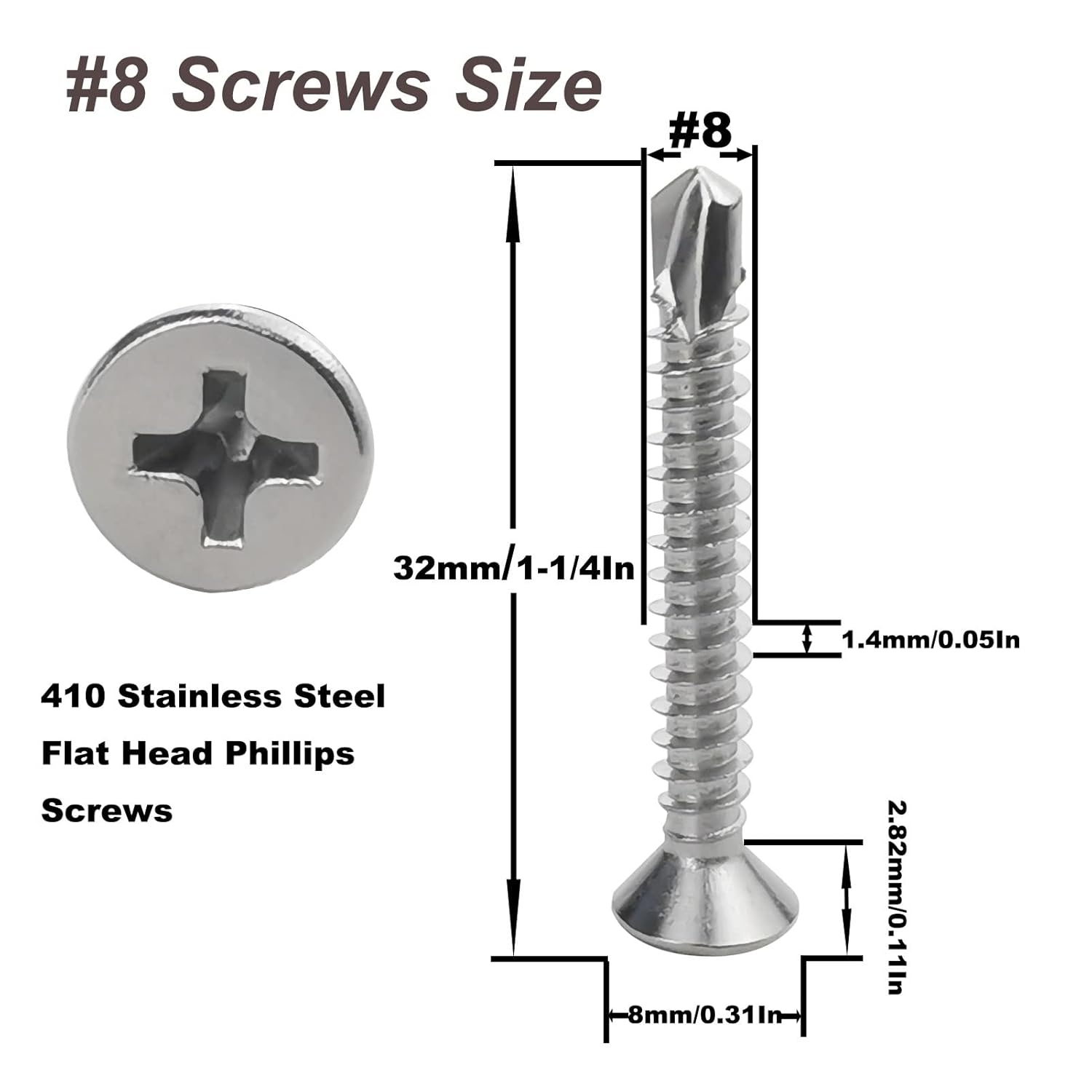 60PCS #8 x 1-1/4" Sheet Metal Self-Tapping Screws,410 Stainless Steel Flat Head Screws Phillips Head Self Drilling Screws High-Strength Fast Sheet Metal Screws (1/2" to 1-1/4" Available) Description Model: 60PCS #8 x 1-1/4" Thread Diameter: #8; Screw Length: 1-1/4"; Phillips Drive #2; Type: flat head sheet metal Self-Tapping screwsFeature These sheet metal self-tapping screws made by 410 stainless steel material which is excellently machined, finished smoothly and longer service life,it's also magnetic.It’s harder and higher tensile strength than 304 stainless steel.Usage The flat head sheet metal screw is widely used for wood, plastic and soft metal etc,such as construction, carpentry, furniture, and more.After-Sales Service We offer hassle free 12-month replacement would be guarantee. Any issue for these fast self-tapping screws,please feel free to contact us, we are always at your service !Package List 60PCS #8 x 1-1/4" sheet metal self-tapping screws