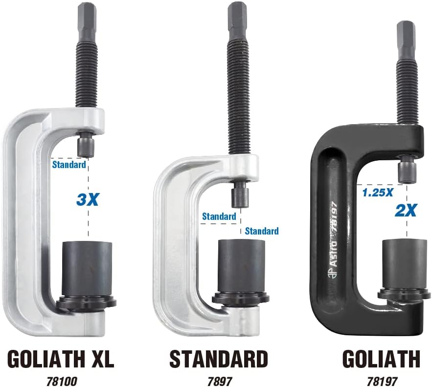 Always looking to provide more professional options in undercar and ball-joint tool categories, Astro Tools introduces the 78197 Goliath Ball Joint Service Tool and Master Adapter Set, our most comprehensive and capable ball-joint service set ever. The all new Goliath C-frame press included in the 78197 set continues the success of our 78100 Goliath XL press with some added benefits. The new Goliath design features 2X the available working throat space when using most adapters compared to our standard press, and 25% deeper arms than any press including the Goliath XL. This means you can more freely position large adapters or stack multiple inline AND enjoy a longer arm length positioning the press away from interferences working on larger applications including 3-1/2 & 4-1/2 ton trucks. In order to achieve both of these changes that result in a great increase in leverage working against the tool, Astro has implemented our beefiest c-frame design yet while utilizing our in-house trusted forged steel alloy that has made our ball-joint presses professional grade. Designed for work on 2WD & 4WD Domestic, Import & Euro vehicles through the 2020’s the included manual provide information for over 1,100 applications. Along with the C-frame press, all adapters in set are100% forged and the large ball-bearing forcing screw is class 12.9 heat treated for max durability.