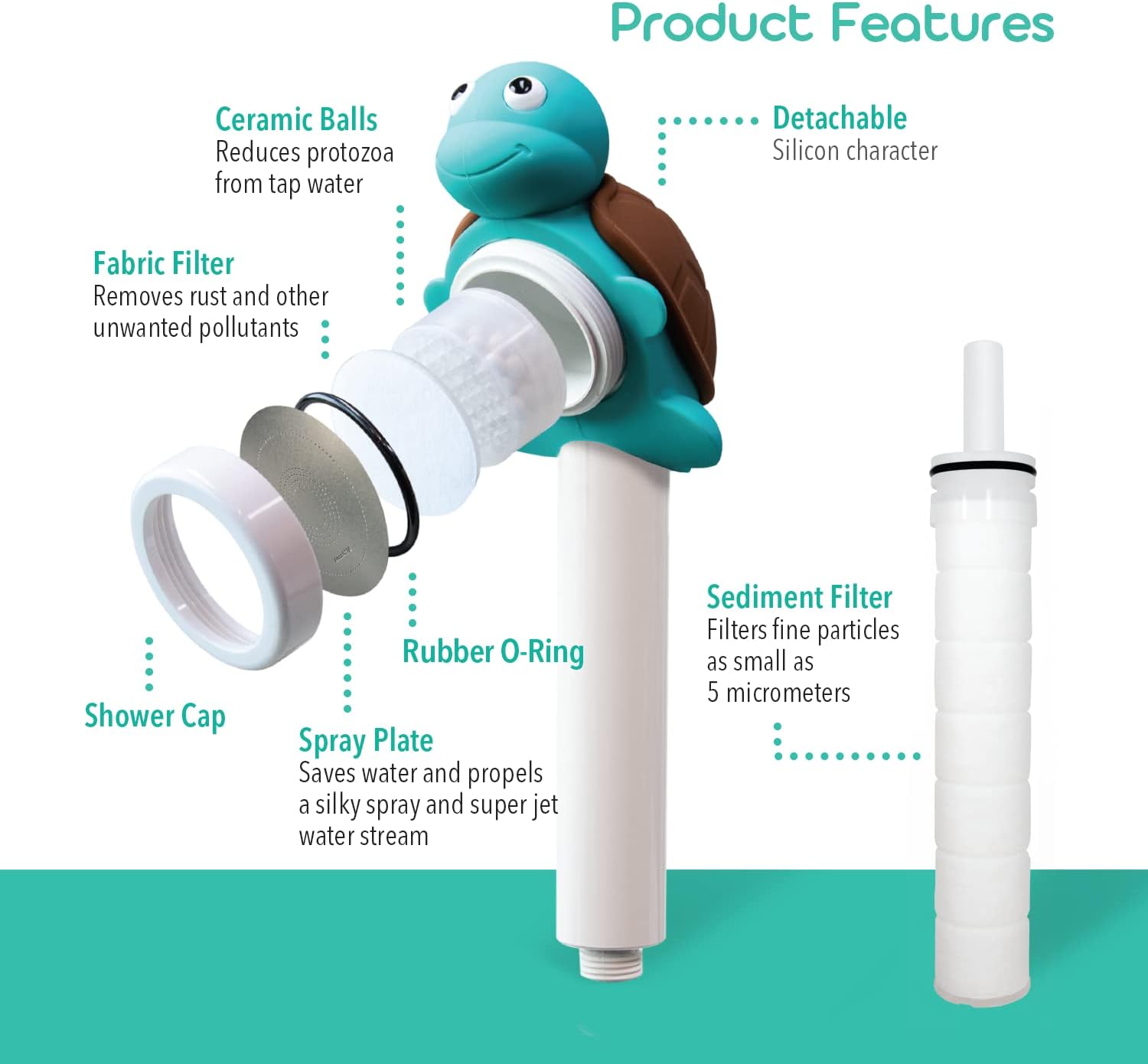 Barumi Livo Filtered Showerhead for Kids Combo Kit | Turtle-Turquoise | Children's Handheld Shower Heads with PVC Hose & Shower Holder
