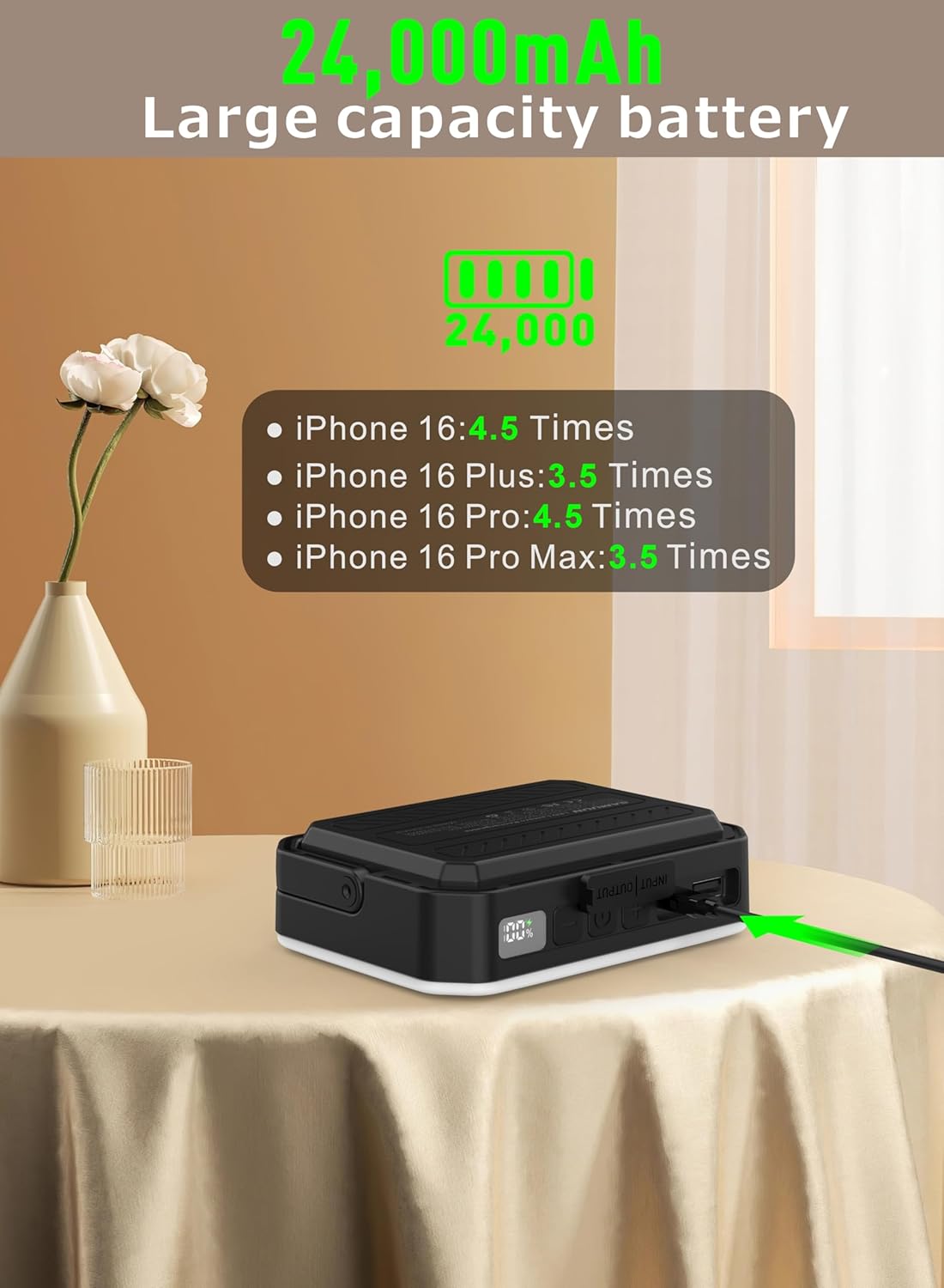 | Included Components | Hook, LED Camping Lantern 24000 mAh, Micro USB cable, Storage bag, User's Guide |