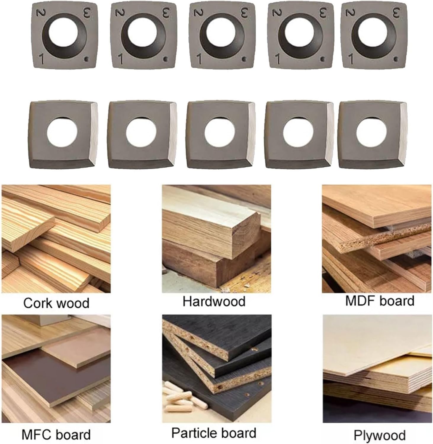 Features:* Carbide tool standard size: 15mmx15mmx2.5mm, 4 indexable cutting edges, 30 cutting bevels, 50mm radius edge polished to mirror finish for smoother cutting and longer tool life.* Made of carbide, more for for long-term use.* This carbide insert is designed for popular woodworking system tool heads for preparation/planing tool heads, slotters, screw heads.* Each individual tool blade is sharpened on four sides, the radius of the 4 sides with radius points, when dull or chipped, all 4 edges can be rotated to expose new cutting edges.* 10 pieces in a plastic container for safe and convenient storage. All carbide inserts come with screws.Specifications:Part Name: Carbide InsertMaterial: CarbideColor: SilverNumber of Slots: 4Size: Length: 15mmWidth: 15mmThickness: 2.5mmHole: Countersunk HoleEnd Cutting Type: Square EndCutting Type: SquareBevel: 30 DegreesCutting Edge: Rounded for for Edge with 4 Round Corners (R-0.5mm)Applicable: Popular Woodworking Planer/Spiral Thickness GaugeApplication: Wood Turning, WoodworkingPackage Contents:10 x Carbide Inserts10 x Screws1 x WrenchNote:1.The real color of the item may be slightly different from the pictures shown on website caused by many factors such as brightness of your monitor and light brightness.2.Please allow slight manual measurement deviation for the data.