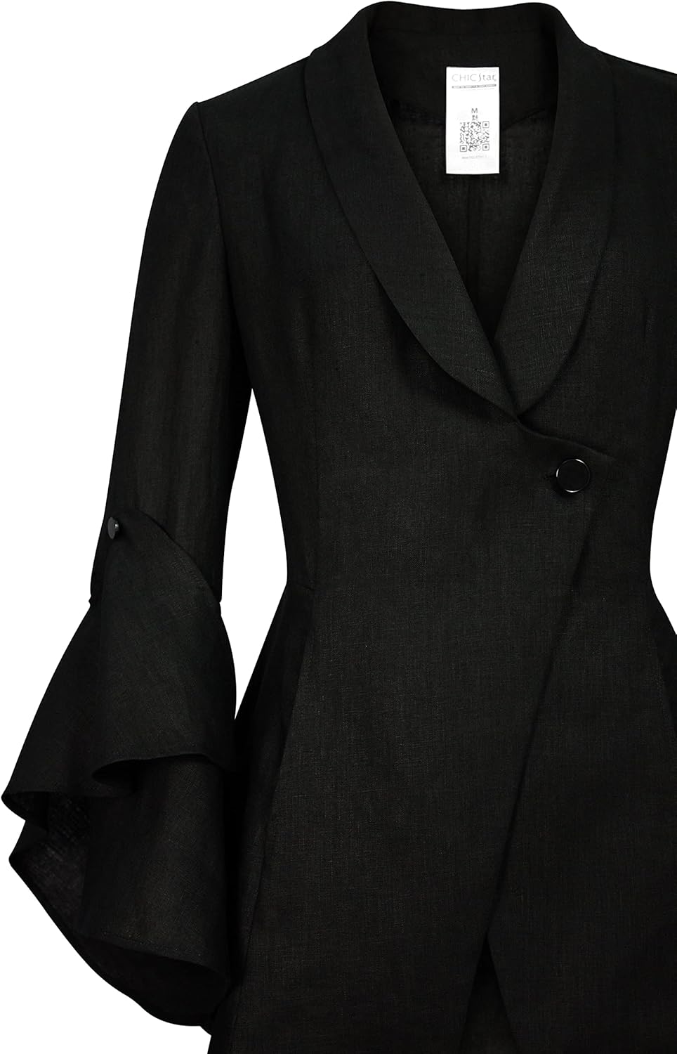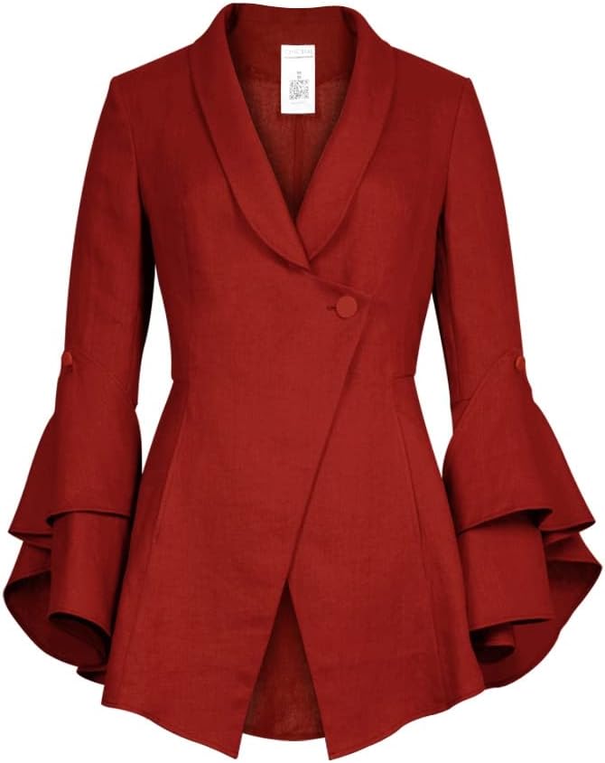 It's a blazer made of linen material. Flared sleeves. Front button closure. Side pockets. Partial lined. Standard size approx. length: 32 inches; Plus size approx. length: 36 inches. MATERIAL: 100% LINEN. CARE: HAND WASH DO NOT WRING DO NOT BLEACH MEDIUM IRON NO TUMBLE DRY DRIP DRY.