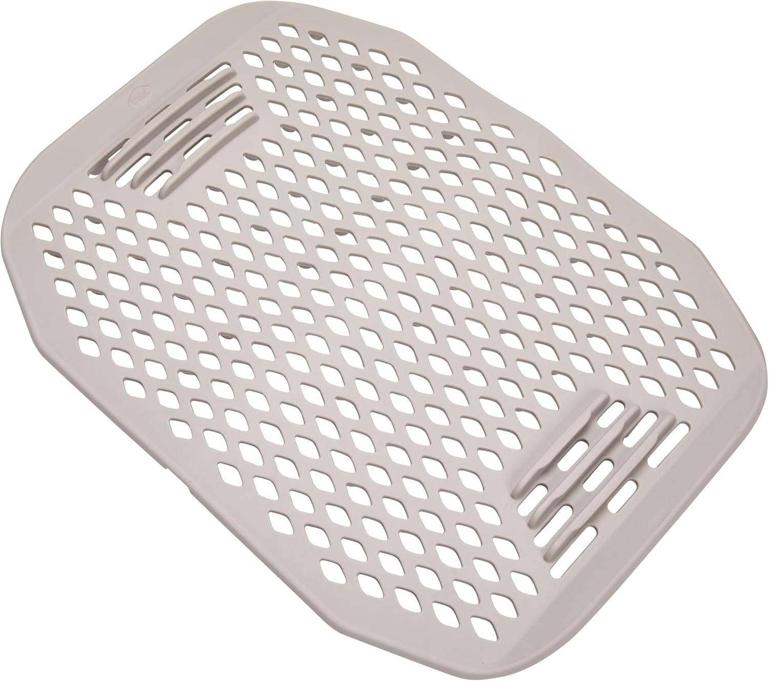 Antimicrobial properties are built in to inhibit the growth of stain and odor causing bacteria that may affect this product. This product does not protect users or others against bacteria, viruses, germs, or other disease organisms. Always clean and wash this product thoroughly before and after each use. KeptClean is a modern approach to tackling the never-ending cycle of cleaning & organization in the kitchen through a collection of mindful, always-working, & innovative design solutions aimed to delight the value and eco-conscious consumer. Each item is made with 30% global recycled standard polypropylene & thermoplastic elastomer. The Large Sink Mat with Rinse Rack Features 6 integrated dividers to neatly keep plates upright for quick sorting & rinsing. Brilliantly engineered for convenience, simply lift & fold to trap food prep debris & discard into the trash with ease! Designed to accommodate most standard drain hole sizes, easy to cut template outlined within the diamond pattern should you prefer to cut the mat to provide drain access. If you prefer to cut/access your drain hole, this mat works perfectly with the Clorox Sink Strainer! Raised feet elevate the mat to allow continuous waterflow while washing and aeration in between uses. This heavy-duty mat offers full sink coverage and protects sink from unwanted scratches & helps cushion dishware from damage. Formulated without PVC/BPA. Disassembles for easy cleaning. Dishwasher Safe.
