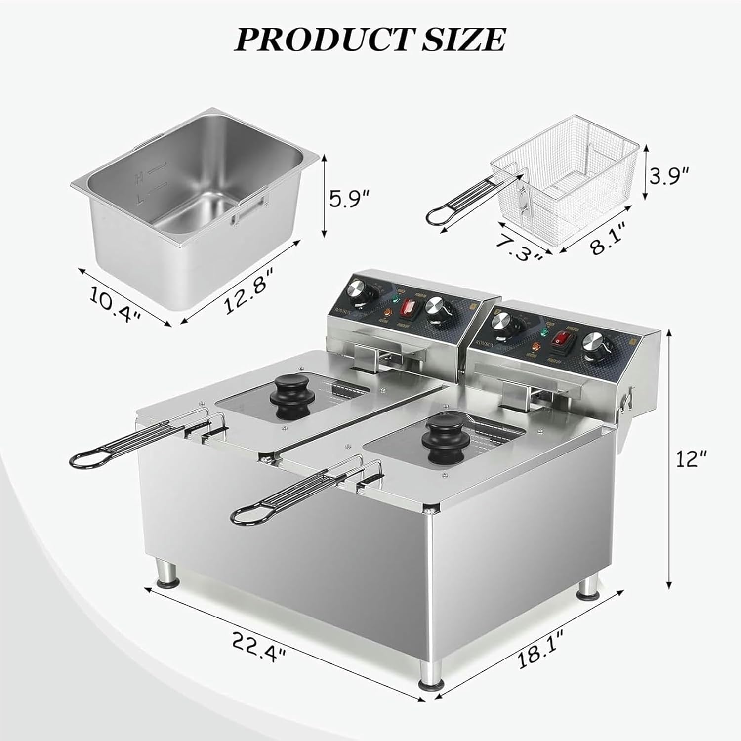 Features:Solid construction, made of heavy duty stainless steel;Temperature indicator light displays when the fryer is heating the oil;Heating pipe distributes even and quick heat;Lid cover prevents the boil oil splashing and safely covers the oil when not in use;Fryer basket with plastic handle prevents scalding of your hands and brings safe and simple use;Thickened tank for long-term use, can be detached for simple cleaning;Great for cooking French Fries, onion rings, egg rolls, fried chicken, perfect for home and commercial use.Specifications:Maximum power: 3000W * 2Voltage: 110V/220VTank capacity: single tank: 10L * 2/10.5QT * 2Temperature range: 60°C - 200°C (140°F - 392°F)Machine size: 22.4 x 18 x 12"/57 x 46 x 30.5cmPot size: 12.8 x 10.4 x 5.9"/32.5 x 26.5 x 15cmBasket size: 8.1 x 7.3 x 3.9"/20.5 x 18.5 x 10cmMaterial: Stainless SteelPackage included:1 x Deep Fryer2 x Stainless Steel Basket2 x Stainless Steel Lid CoverNotes:1-2cm error might exist due to manual measurements, please kindly understand. The colors deviation might differ due to different monitor settings.