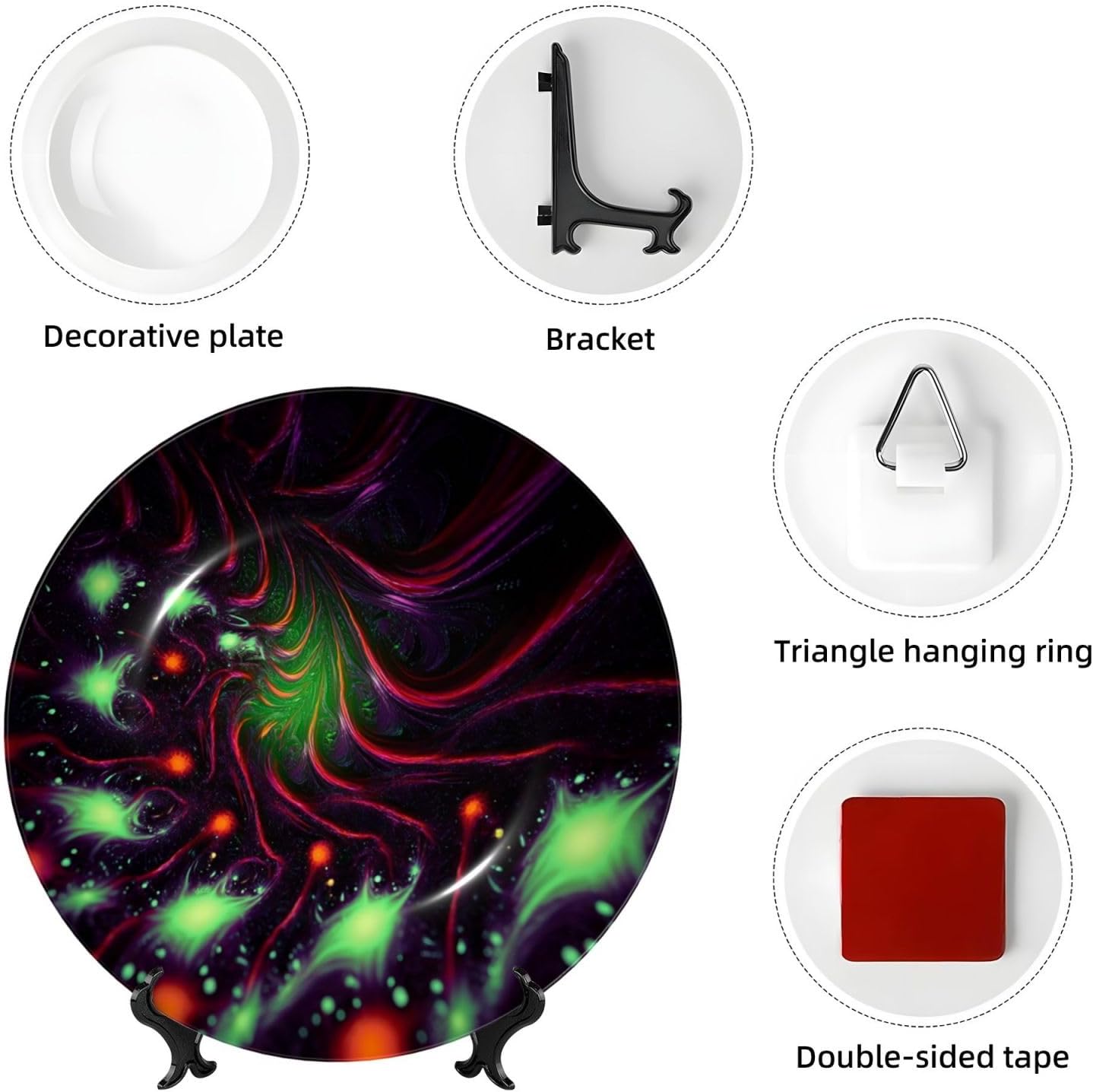 gokays decorative platedo you feel that your table is monotonous? Then use our decorative plate to add a little fun to the monotony of life.featuressize - 6 inch diameter;7 inch diameter;8 inch diameter;10 inch diametermaterial - ceramic design - Fantasy Sci-Fi Dizziness package - 1 x ceramic decorative plate, 1 x stand, 1 x pothookwhy choose gokays decorative plates?advantageas manufacturers we follow current trends and bring you the latest home fashion. Salad plates ideal for placement at home or in the office. Traditional porcelain making technology, fine workmanship. Ceramic dinner plates is a good gift for family and friends.convenient to useour dinner plates rack for display has 2 ways to use, you can just place the bracket base on a flat surface first, and then put the plate on it, also you can stick the provided pothook at the back of the plate, and then stick the plate on the wall, you can choose the suitable installation method according to the actual situation.occasionour ceramic ornaments salad plates is a perfect decorative and collection for any niche, table, or mantle at your home. Perfect for your office, home, living room, dining room, playroom, kitchen, cafe, study, studio, club, bar, and others.in a surprise for your family and friends!porcelain dessert plates is a perfect gift for any person in your life. You can give it directly to your lover as mother's day gift/father's day gift/birthday gift/christmas gift/valentines day gift/anniversary gift/wedding gift/housewarming gift/new home gift.start with our funny decorative plate, refresh your rooms!