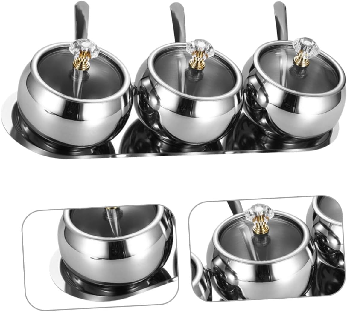 Package List 3 Sets x Seasoning Jars with Lid and Spoon 1 x Organizer Tray Characteristics -Versatile functionality: suitable for storing condiments such as sugar, salt, coffee, or spices, this jar set meets a variety of culinary needs condiment jar for cooking - Color: Silver -Product Info: Stainless steel seasoning jars -Material:Stainless steel -Practical accessories: includes a matching spoon and a secure lid, providing convenience and ensuring your condiments stay fresh and ready to use seasoning containers with lid -Stylish addition: its modern and elegant design makes it a standout piece in your kitchen, combining practicality with aesthetic appeal sugar bowl with lid and spoon -Smooth finish: the stainless steel material with a smooth finish offers a simple look and feel, elevating the style of your kitchen while being easy to clean -Organized storage: the tray design keeps your jars neatly arranged and prevents spills, helping you maintain a clean and organized cooking space pepper jar - Size: 31.50X10.00X9.00cm/12.38X3.93X3.54inGoods Descriptionstainless steel seasoning containers Keep your kitchen tidy and your condiments within reach with this stainless steel spice box set.metal condiment bowl The sugar bowl features a lid and spoon, ensuring your ingredients remain fresh.seasoning container bottles The included tray offers a convenient storage solution, making it suitable for organizing your spices, sugar, salt, or coffee