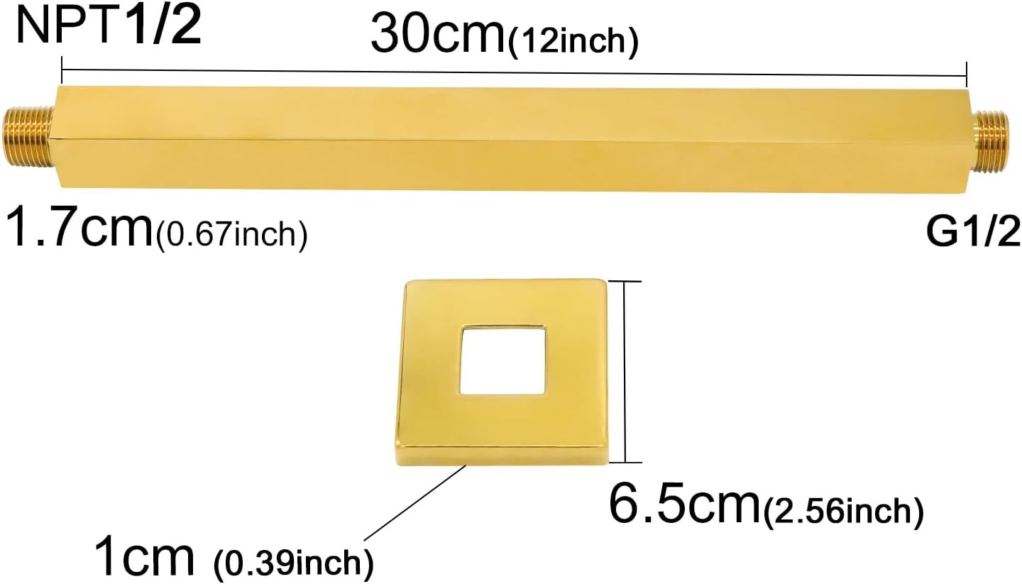 Product specificationMaterial: Full extra thick brass construction, heavy duty and long life use.Finished: Chrome.Connector: ½'' NPT Standard Connection.Length: 12 inch long shower arm with flange straight ceiling mounted.Use For: Shower Arm for 8'', 10'' , 12'' , 16'' Rain Shower Head.Installation: Easy & fast installation, no tool required.
