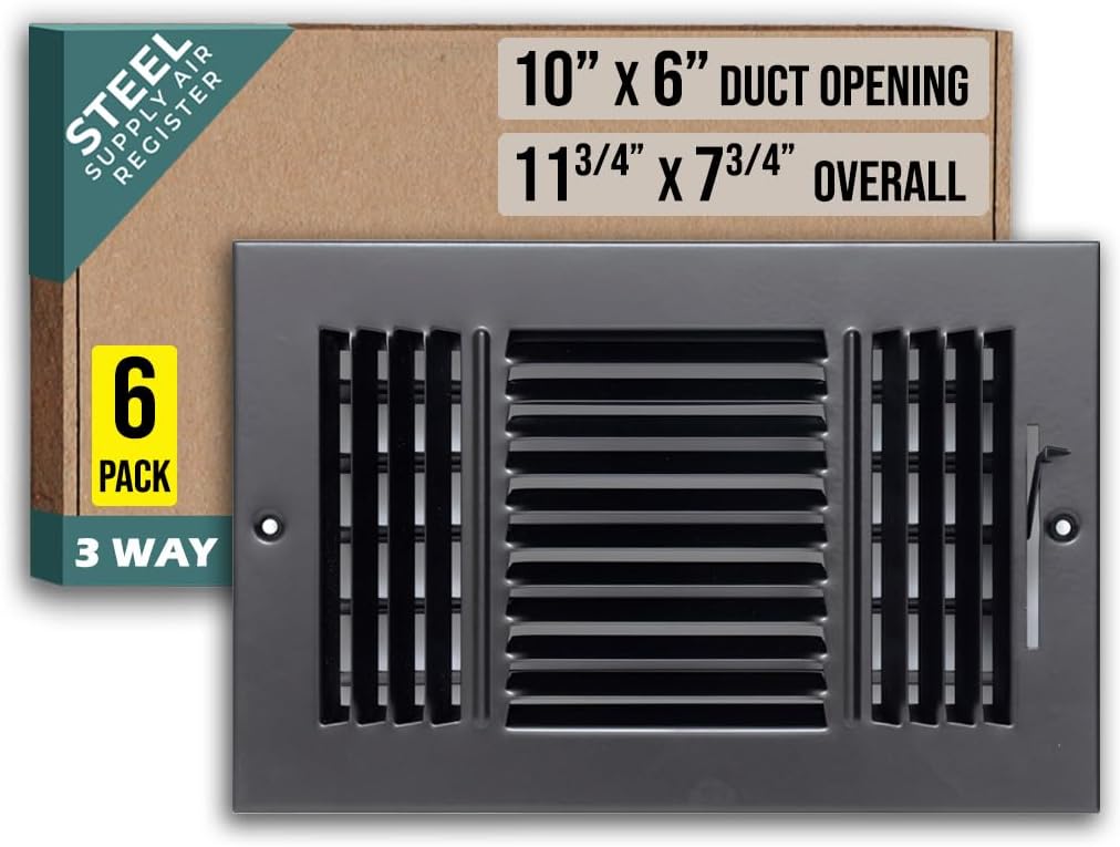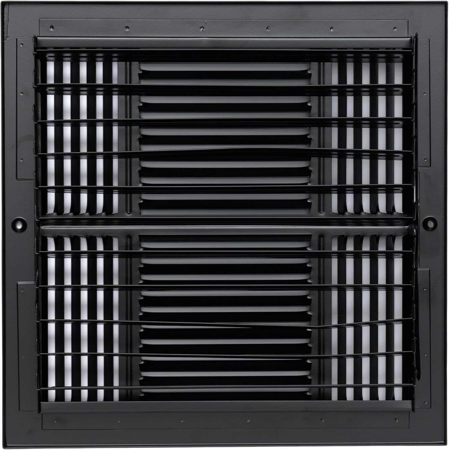 3 WAY Supply Grille for 12x12 Duct Opening, Black, Steel 1/2 inch spaced fins set at 40 degrees. Primary use: Side wall and ceiling. Screws are included with the system, standard. All-steel construction. Durable black powder coated. Standard color is black.How To Measure A GrilleAlways measure the size of the duct opening (the 'hole' in the duct/wall). Do not measure the entire size of the register itself. Size of the grille is; listed size +1.75-inch.Understanding Width & HeightIn a grille size, the first number always represents the width and the second one is the height. As an Example: If the hole on your wall/duct is 12 inches wide by 12 inches tall, order 12x12 option. For this particular product you're viewing at the moment, the hole on your wall/duct opening should be 12x12 duct opening. Click the 'Add To Cart' button now to order your Air Supply Grille!