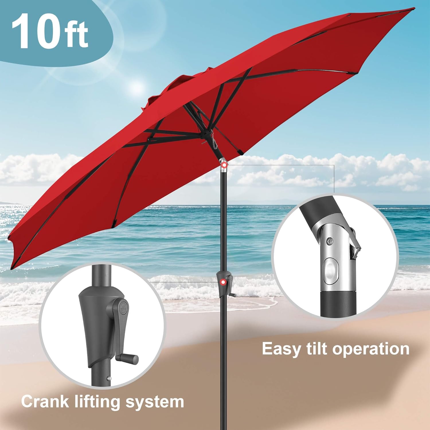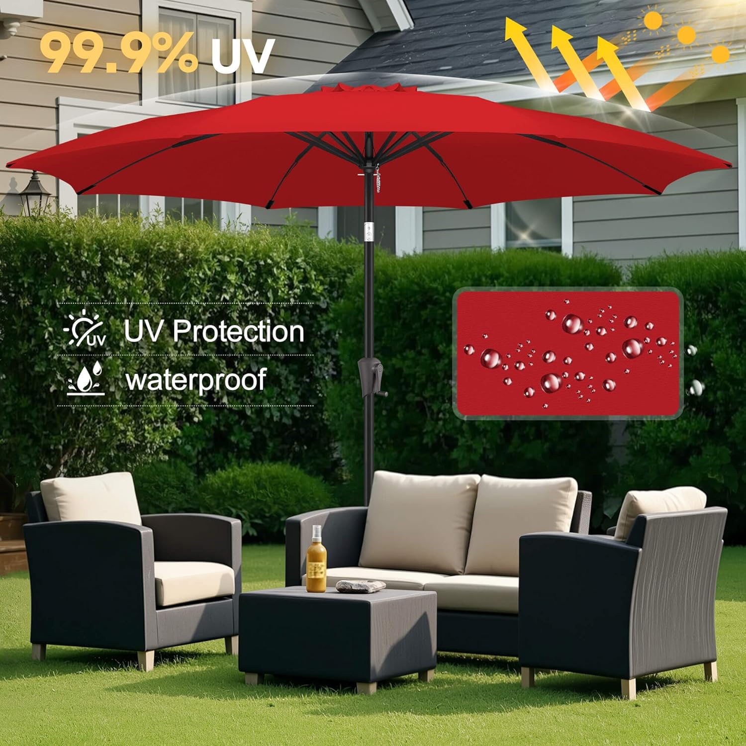 This complete 10ft patio umbrella set delivers exceptional outdoor coverage with its expansive 117-inch diameter canopy that comfortably shades 47-59 inch round tables for 6-8 people, paired with a universal 70.8"L × 16.5"W cover compatible with most 6-11ft standard umbrellas (offset models excluded). Designed for all-weather performance, the premium 200GSM waterproof fabric provides superior sun protection by blocking 99.9% of harmful UV rays, while the tilt-adjustable pole allows for customizable shade coverage throughout the day. The included 40-inch folding fiberglass pole enables effortless, ladder-free cover installation, making it accessible for users of all heights. Built to withstand challenging conditions, the heavy-duty construction features 8 reinforced alloy ribs and a sturdy 1.5" steel pole for maximum stability, complemented by a bottom rope lock system that secures the umbrella during windy conditions, ensuring long-lasting durability for patios, gardens, and commercial outdoor spaces