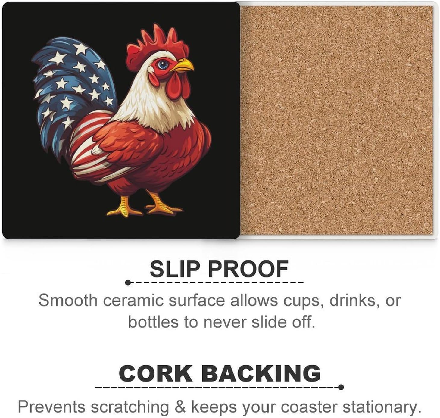 Funny Chicken Us Flag Coasters for Drinks Square Table Coasters Set Cup Mats with Cork Base
