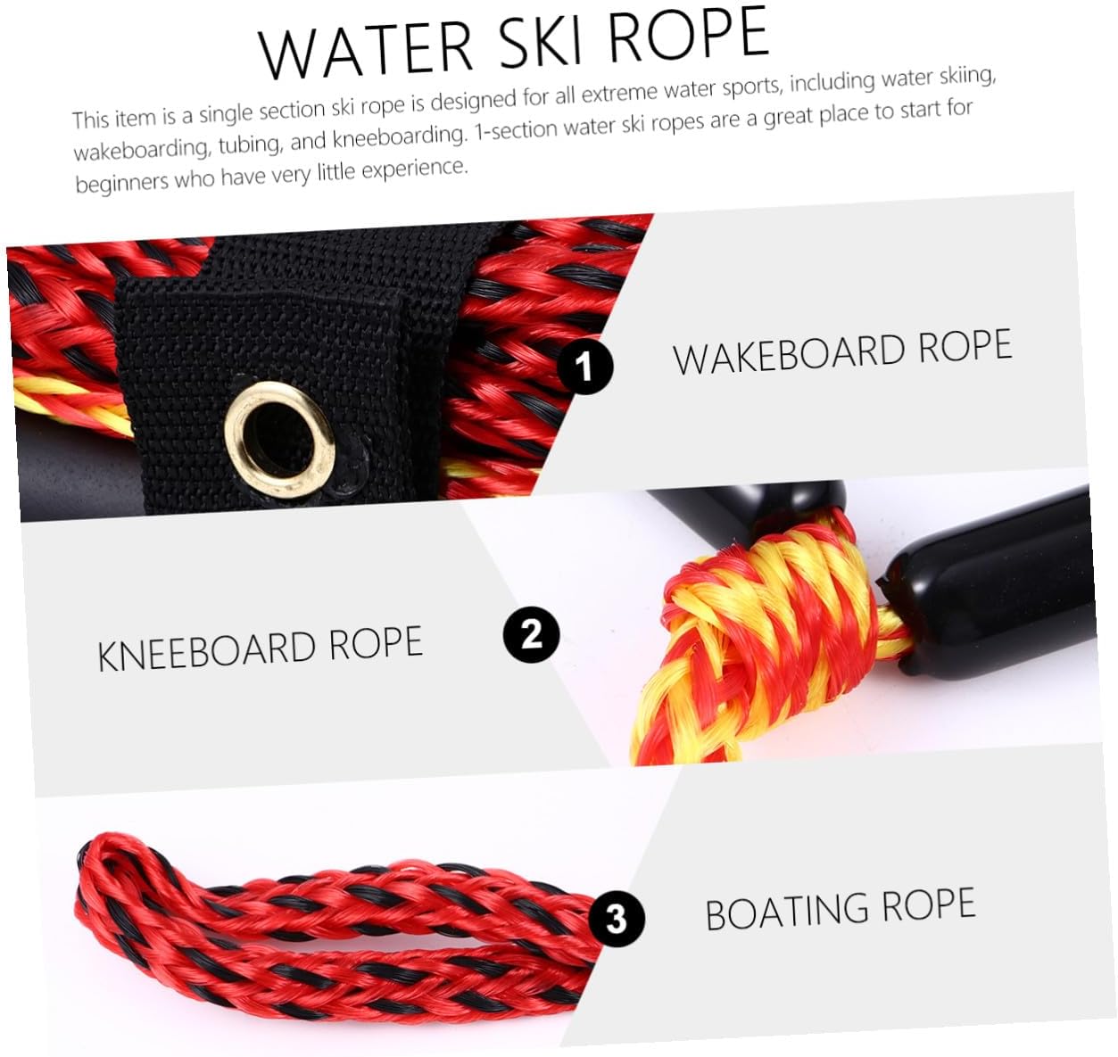 Package List 1 x water ski rope Features -Product Info:Water skiing rope - Material: Nylon. - Size: About 2300.00X0.80X0.80cm/903.90X0.31X0.31inch. - Bright color, easily be seen on the water, high abrasion and UV resistance. - ColorBlack - The braid structure makes this a lightweight, easy to handle rope water ski rope and handle. - Made from nylon, it provides excellent resistance against moisture degradation tubing rope. - The wakeboard rope features a lightweight, yet sturdy handle ski ropes for water skiing. - Suitable for slalom water skiing, wakeboarding, knee boarding or hooking the rope up that bit closer to the boat ski rope.Goods Informationkneeboard for boating 1-section water ski ropes are for beginners who have very little experience.water ski rope boat This item is a single section ski rope is designed for all water sports, including water skiing, wakeboarding, tubing, and kneeboarding