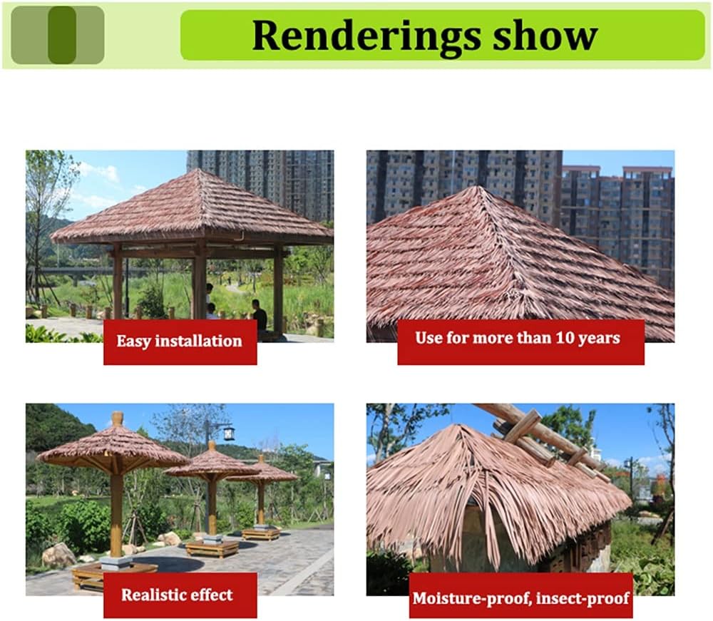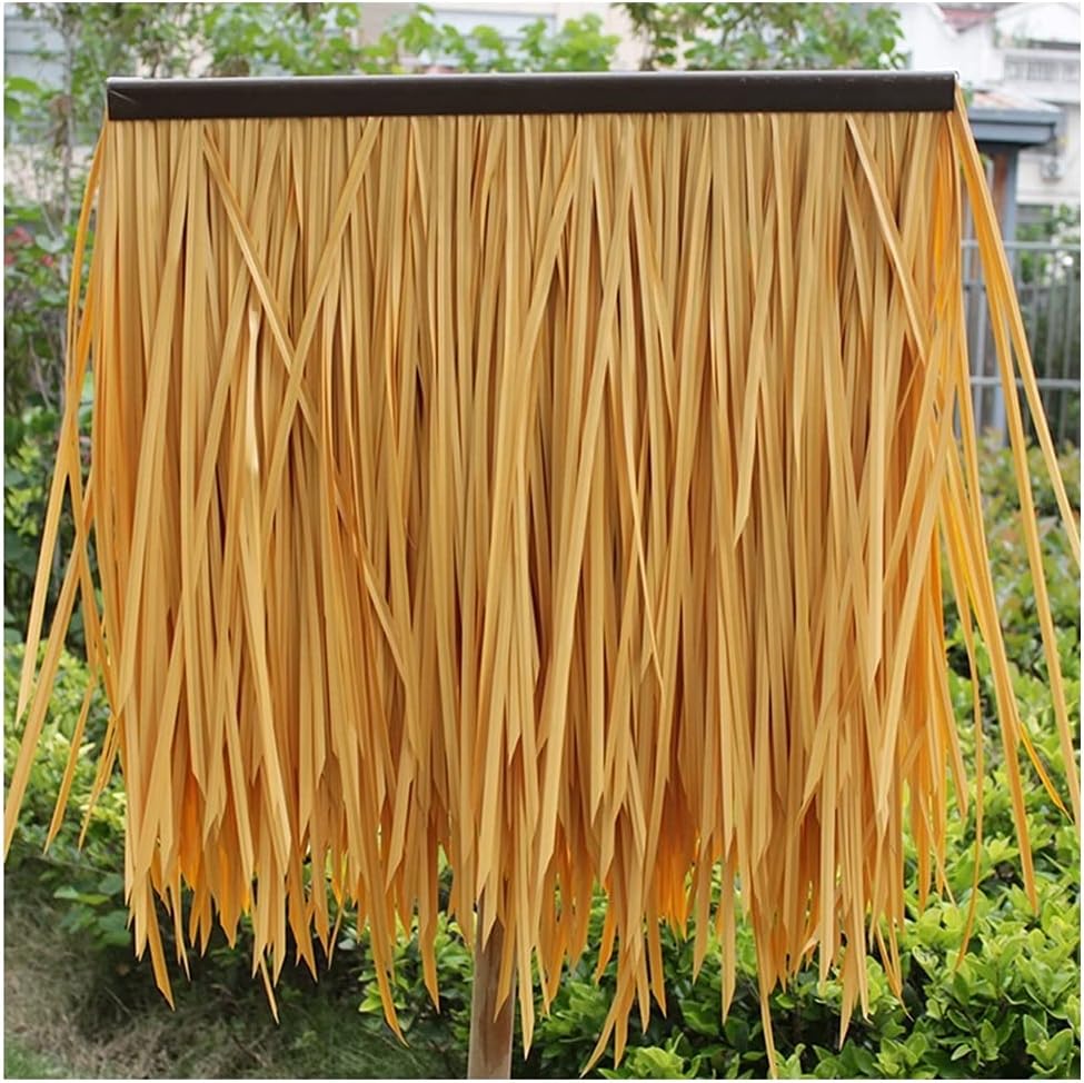 ▶Product specifications:Product Name: Simulation ThatchProduct material:Plastic PE materialProduct size:1pcs:0.5X0.5cm(6pcs/㎡)Product features: no rust, durability, easy installation, etc.Product use: hotel / hot spring resort / park landscape / seaside barbecue bar / restaurant decoration, etc.▶Product Features :1. The polymer resin simulation thatch is formed by pressing the polymer plastic components through a mold,Overcome the natural thatch easy to fade, short use of time and other shortcomings.2. The artificial thatch is added with flame retardant and other ingredients; it reaches the B1 flame retardant effect.3. Present the color and texture of natural thatch. can last for more than ten years.4. Installation is simple and quick. No need for regular maintenance and replacement like natural thatch, eliminating the need for maintenance and worry-saving.