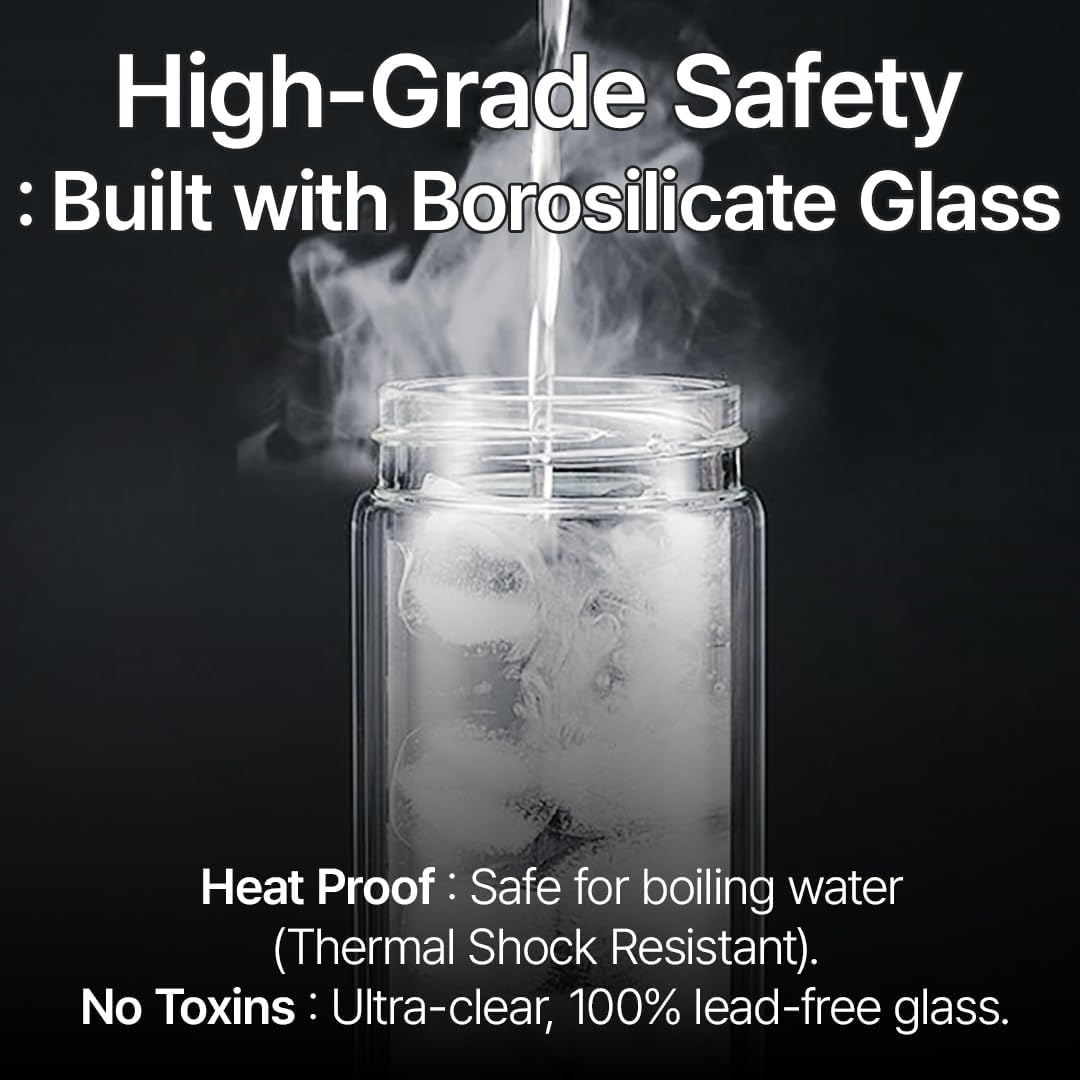 This glass tea infuser bottle is designed for simple and controlled tea brewing with a one-touch magnetic brewing system. The magnetic structure allows the stainless steel infuser to connect and separate smoothly, making it easy to manage loose leaf tea during everyday use. Made with double wall borosilicate glass, this tea tumbler is suitable for hot or warm beverages and helps reduce direct heat transfer when holding the bottle. The clear glass body lets you see the tea as it brews, adding a visual element to the drinking experience. The bottle includes a removable stainless steel infuser with an extra-fine mesh design, allowing tea leaves to expand while helping keep residue out of your drink. After brewing, the infuser can be easily separated to enjoy clean, smooth tea without additional strainers. Designed with portability in mind, the slim shape fits easily into bags and standard car cup holders, making it suitable as a portable tea bottle for commuting, travel, or daily routines. The lid features a leak-resistant silicone seal to help reduce spills during normal handling. Whether used at home, in the office, or on the go, this tea bottle works well as a glass tea tumbler, tea infuser bottle, or everyday tea flask bottle for loose leaf tea, herbal blends, and infused drinks. Its reusable design offers a convenient alternative to disposable tea filters and single-use cups.