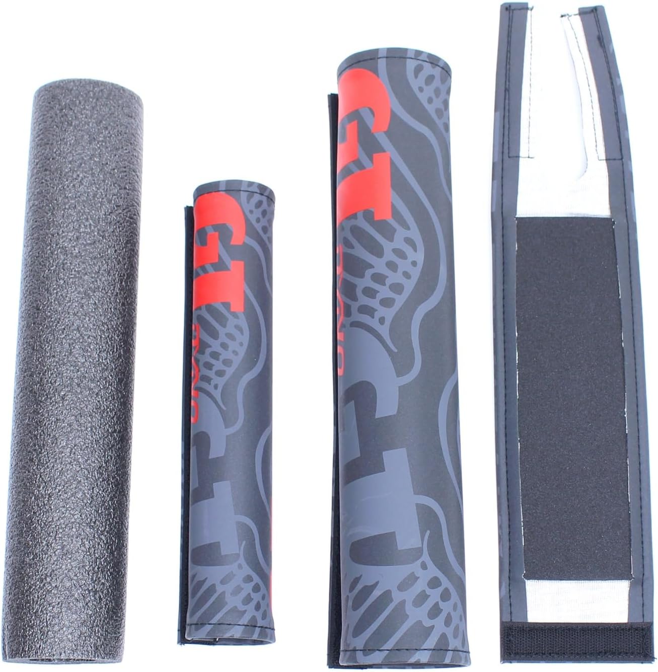 Original GT Bicycles 3 piece graphic pad set. Vintage red GT and Dyno logos on black and grey pad with subdued wings logo. Kit includes one handlebar pad w/ graphic wrap, one stem pad w/ graphic wrap, and one top tube pad cover with foam for both 32mm and 35mm top tube diameters.
