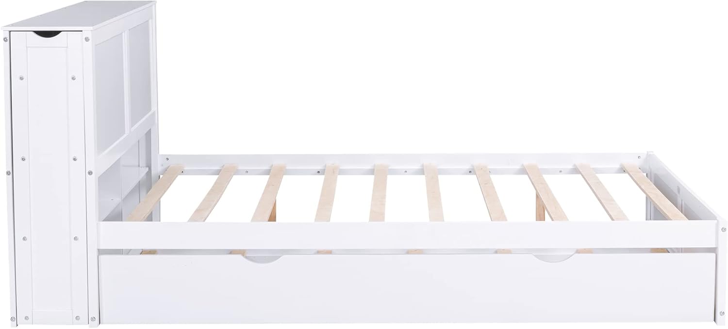 Welcome to shopping with us. Your satisfaction is our greatest motivation. If you have any problems, Please feel free to contact us. We will try our best to make you satisfied. This queen platform bed with storage and trundle is simple and fashionable. The headboard features 4-tier pullable shelves for your storage. The trundle can be located on left side or right side, so that you can position the bed freely according to your bedroom layout. The whole construction is made of solid wood and MDF, so it’s designed for long-term use. Description Material: Pine Wood+MDF Size: Queen Color: White Numbers of Package: 2 Spring Box: No need Assembly Required: Yes Origin: Vietnam Dimensions Overall Product Dimension: 111.6''L x 93.6''W x 39.4''H Package Dimension: Please refer to the Specification queen Bed: 80.7'' x 61'' Total Height: 39.4'' Number of Bed Slats(Upper/Trundle): 10pcs/7pcs Recommend Mattress Thickness of Bed (Upper/Trundle): 8''-10'' Overall Product Weight: 170lbs Bed Weight Capacity(Upper/Trundle): 750lb/250lb