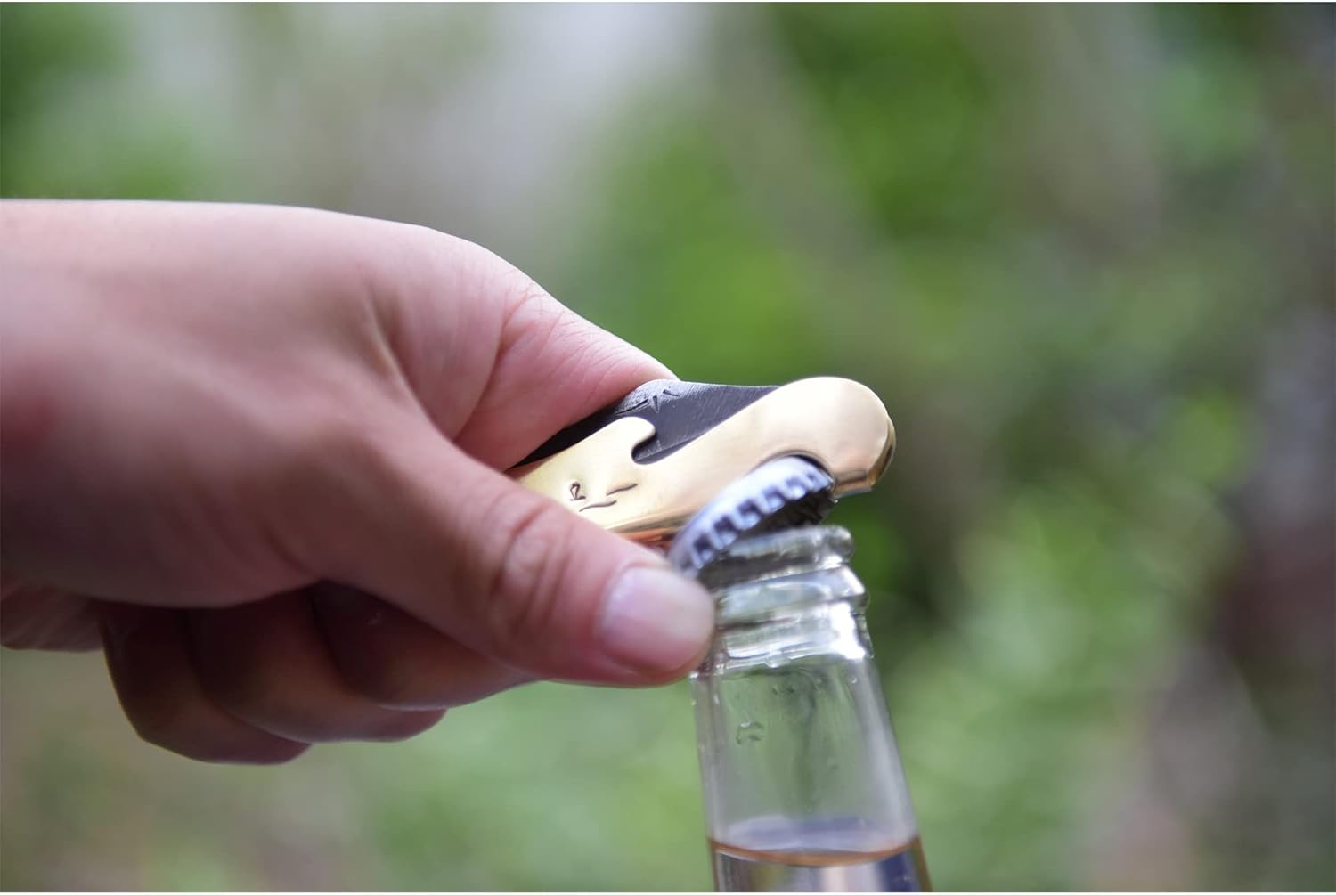 Experience a multipurpose yet aesthetically pleasing handcrafted knife that is traditionally intended for household chores. It is designed with a famous Ukiyo-e scenery, Mt. Fuji viewed from the Miho Peninsula. This functional and multipurpose knife has a double edge blade allowing you to have a sharp and consistent cut. The handle that has been designed to be a bottle opener is made of brass which makes it durable and aesthetic at the same time. Dimension: 4.4in W x 1.4in D x 0.4in H