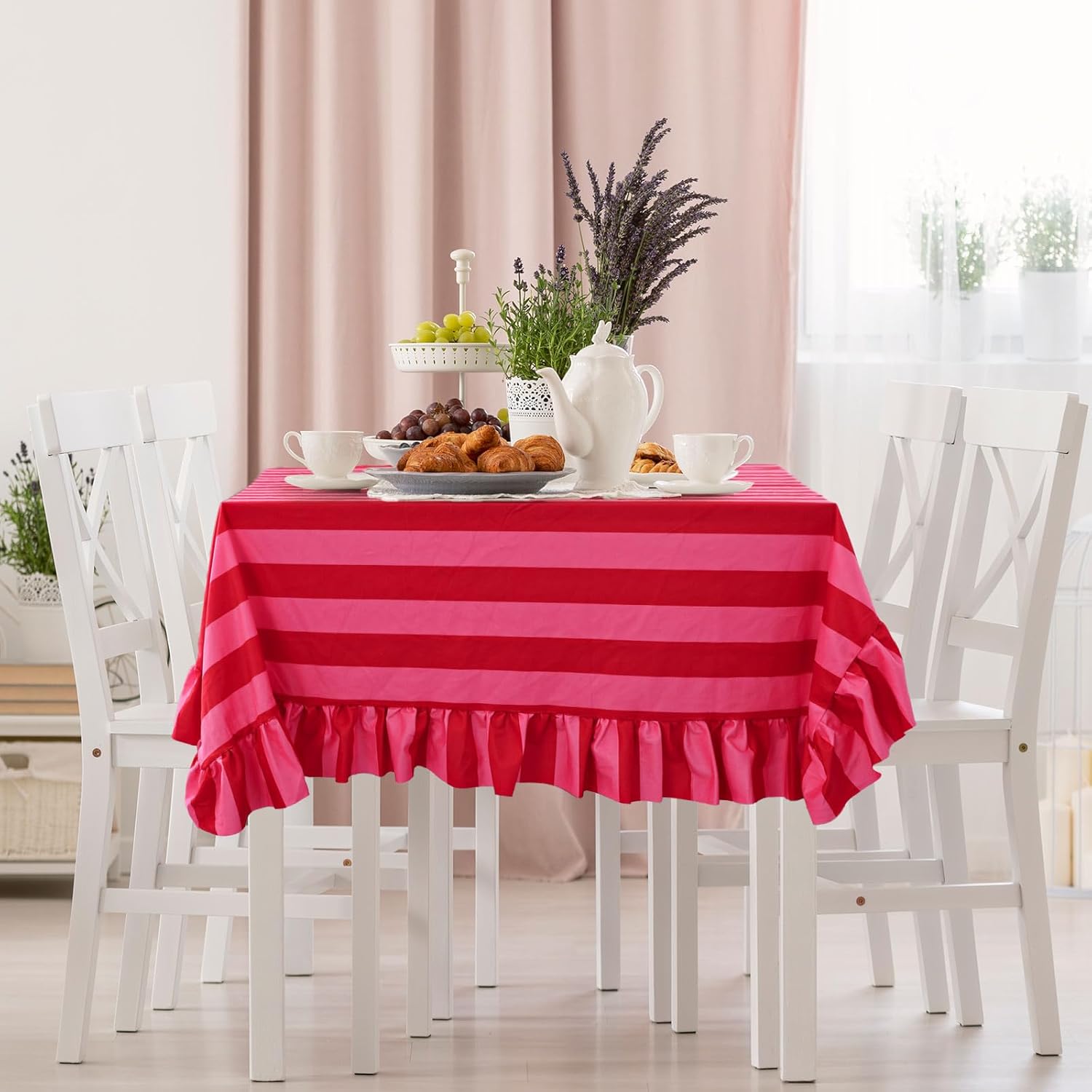 Features: Delicate Design: Adopting the pattern of pink and red stripes, designed with exquisite ruffle, charming and eye-catching, keeping the table clean and decorative. Great Material: Made from quality material, soft and sturdy, not easy to break or fade, ideal for wedding, baby shower, themed party and everyday use. Specifications: Size: 60 x 120 inch Package includes: 1 x Tablecloth