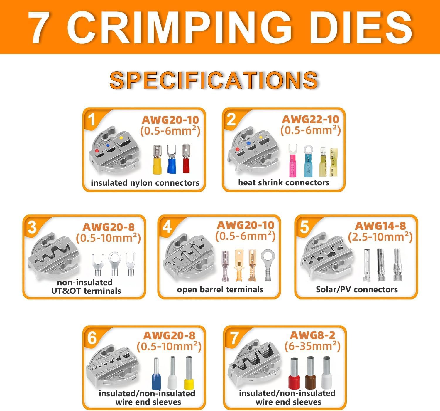 | Included Components | 7 x different types of crimping inserts, crimping tool, wire stripper |