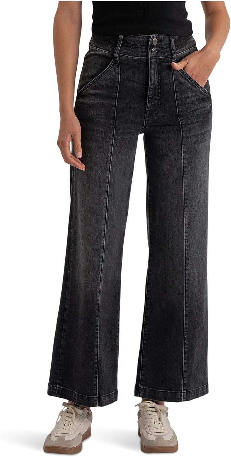 Flawless fit, KUT from the Kloth Meg High-rise Fab Ab Wide Leg Slanted Front Pockets. Designed with a relaxed fit that's fitted through the hips and thighs, these jeans flow into a wide leg silhouette that exudes modern, trend-forward appeal. The high-rise waist flatters your shape, while the Fab Ab front pockets smooth and sculpt for a confident, sleek look. Finished with a zip-fly and button closure, belt loops, and five-pocket styling, the Meg is your go-to for both casual weekends and chic nights out. 77% cotton, 14% Lyocell, 7% polyester, 2% elastane. Machine washable.