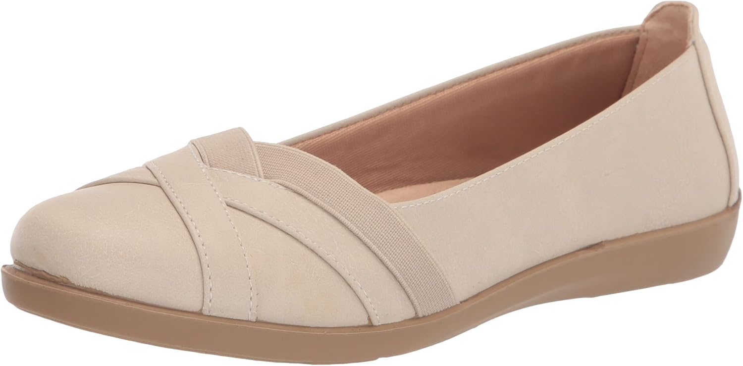 Show off your style all day long in these effortless ballet flat dress shoes for women with endless comfort and style. Faux suede with stretch gore, round toe, slip-on fit, lightweight and flexible design, and crossover strap design. Toe box, heel counter, and linings partially crafted with recycled materials. Soft System® comfort package provides all-day support, flex, and cushioning. Active Arch® contoured insole with extra arch support and cushioning. Traction sole provides you with extra stability. Just Right Height 1 inch heel.