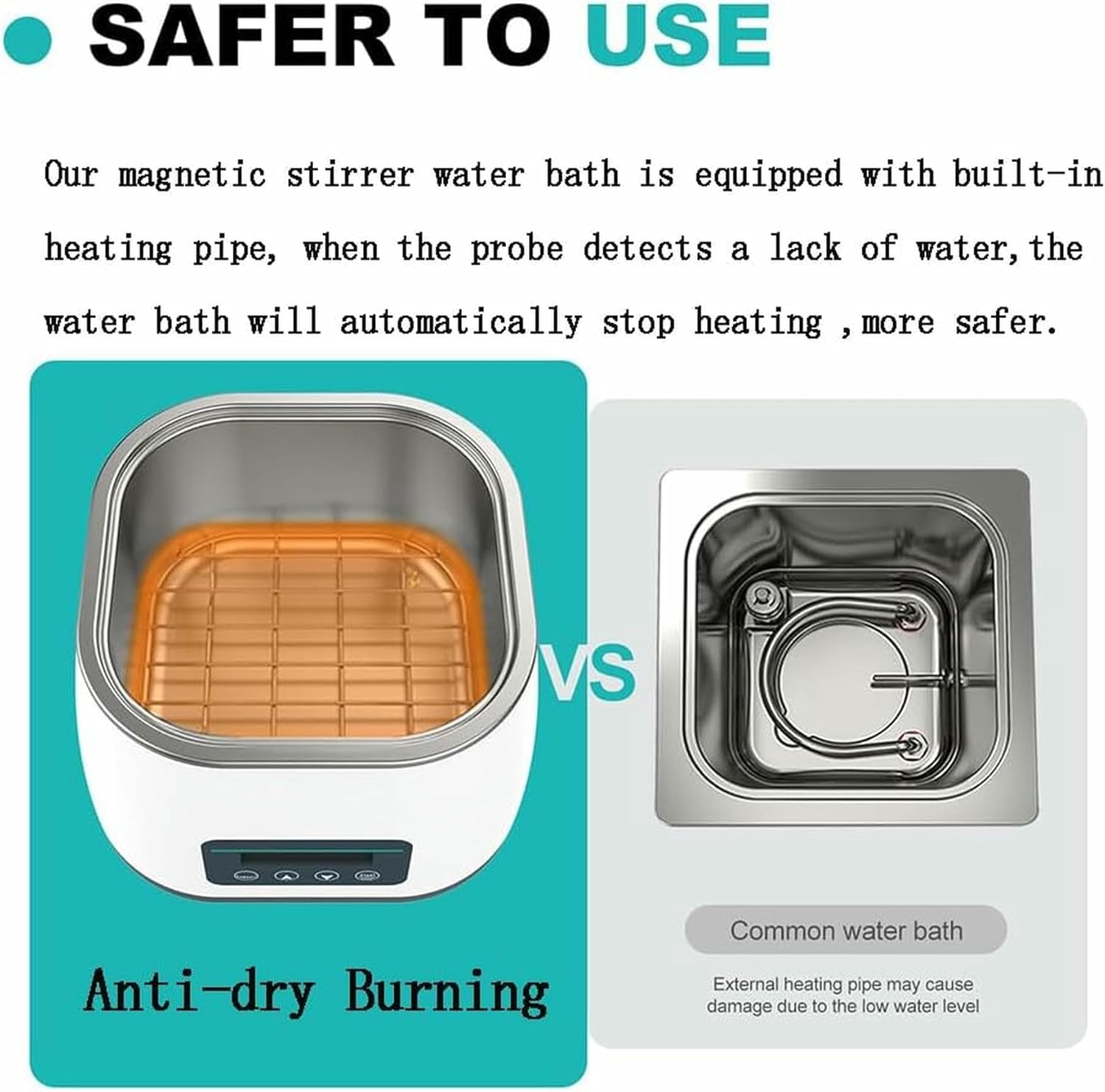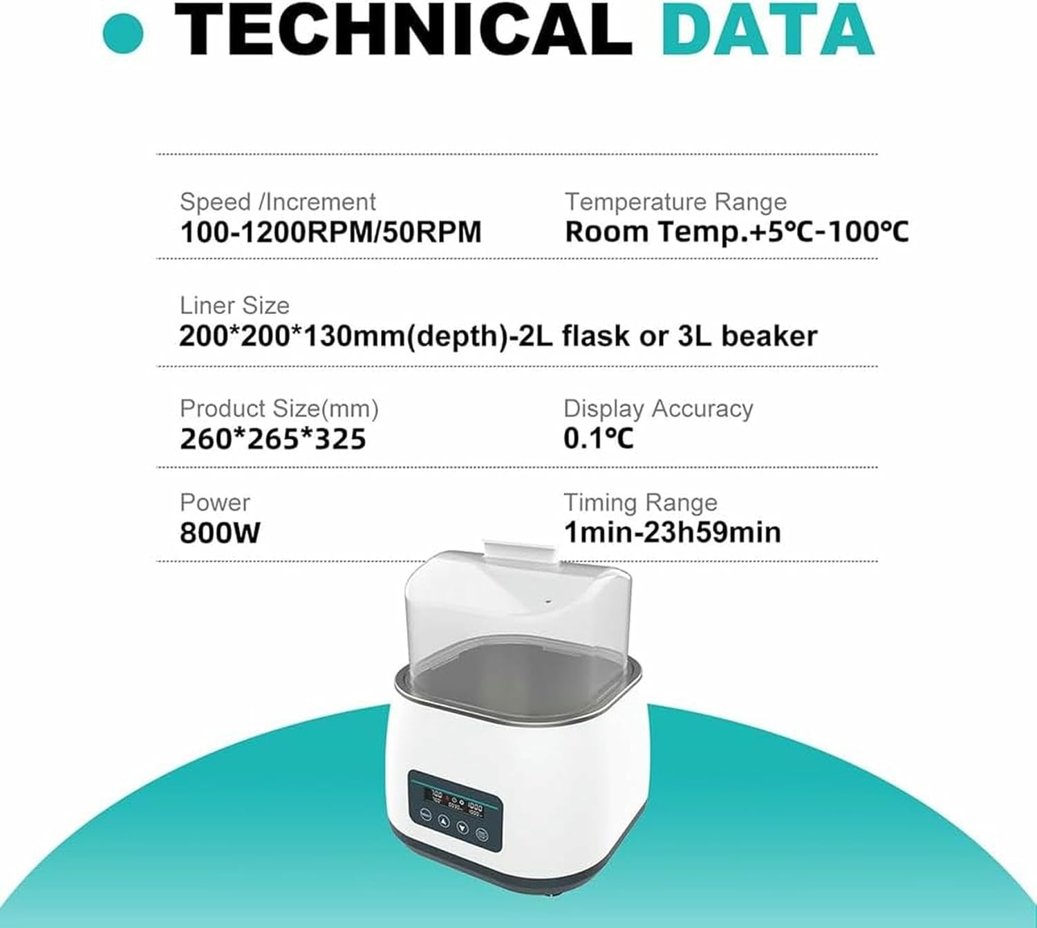 Specification:Name: Water bath with magnetic agitatorNote: Vas of beaker not includedPower: 800WMotor type: Bloobless motorTemperature control range: Ambient temperature +5 ℃ A 100 ℃Precision of temperature control: ± 0.1 ℃Time range: 1 min-23h59minSpeed range: 100-1200 rpmInner cavity size: 200x200x130mmmProduct size: 260x265x325mmWeight: 3.5 kg