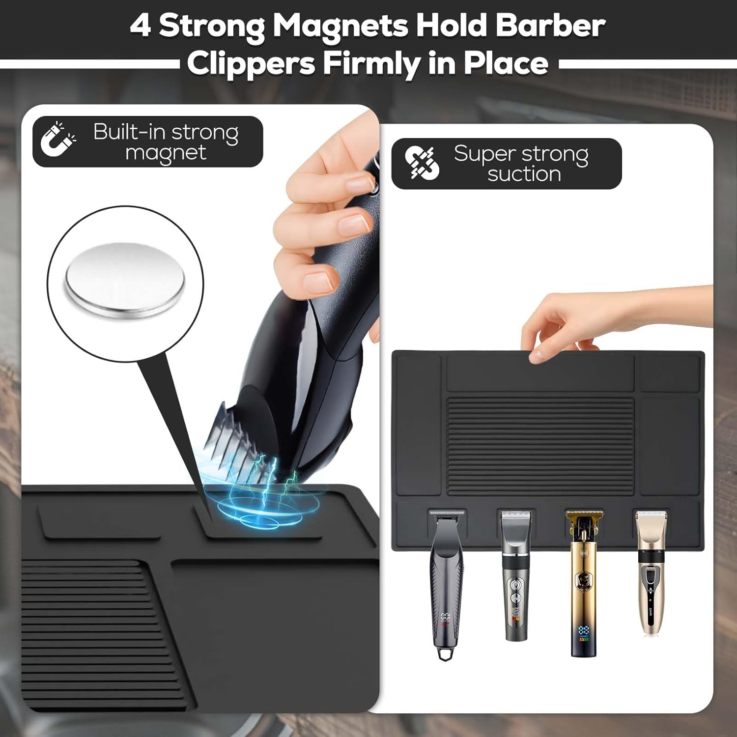 • Strong Magnetic Barber Mat: Premium magnetic barber mat features 4 powerful magnets to securely hold clippers of all sizes and prevent accidental drops. Integrated slots & textured zones organize scissors, guards, combs, trimmersfor instant access. Perfect barber station organizer for clippers and tools, to maximize efficiency in busy barbershops