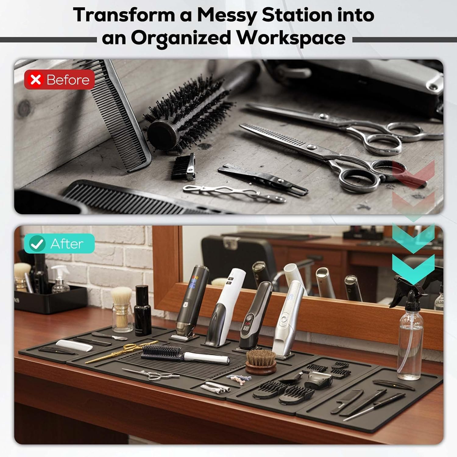 • Dual-Sided Non-Slip Design​​: Textured surface + rubber backing ensures ultimate stability. Non-slip mat stays firmly in place during haircuts, with no sliding even when pulling tools vertically. Ideal for slippery countertops or barber desks
