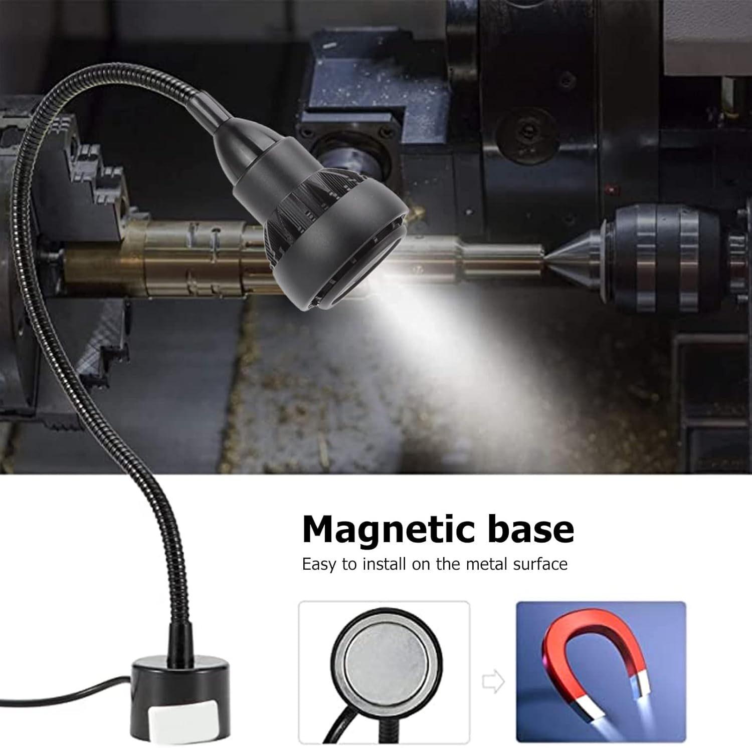 Item Type: Light Machine Tool Material: aluminium. Weight: Approx. 437 g/15.4 oz Product Size: Lamp head diameter: 60mm/2.4 inch Base diameter: 42 mm/1.7 inches. Hose length: 38 cm/15 inches. Power line length: about 1.5m/59.1inch Power: 9W Light Source: White Light Installation Method: Magnetic Base Controls:Switch Package List: 1 x Machine Tool Light