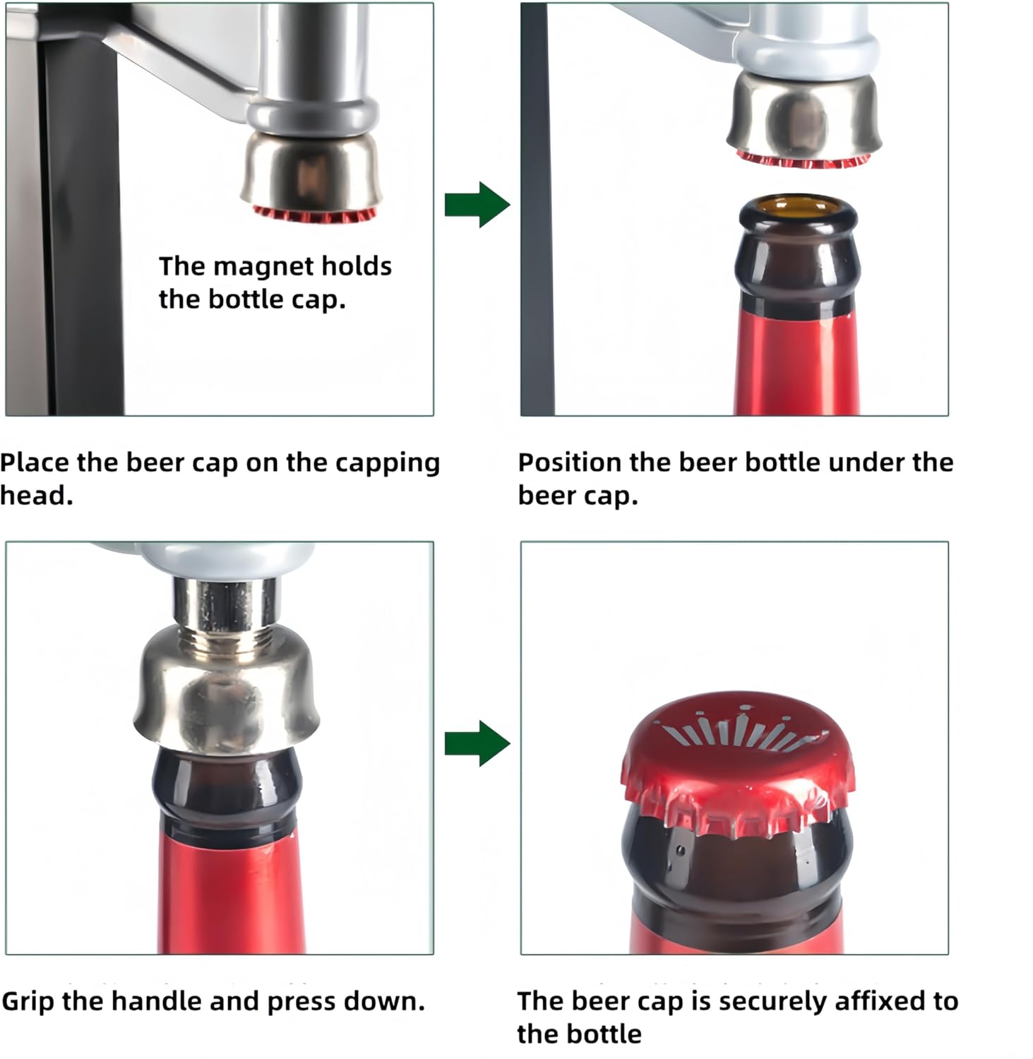 Manual Beer Bottle Capper, Home Brewing Beer Bottle Capping Machine, Bench Stand Beer Bottle Sealer with Adjustable Height for 26mm Cap, Anti-Slip Rubber Pad Labor-Saving HandleBeer Bottle Capper is compatible with 26mm/1.02” caps, suitable for non-threaded, single-edged neck glass bottles including standard beer bottles, soda pop bottles, champagne bottles, etc.Home Brewing Beer Bottle Capper features adjustable height from 7.9in to 18.3in, easily adjusted via a convenient pressing button to suit various bottle sizesBeer Bottle Capper is built-in with a strong magnet to hold the cap in place as you press down, allowing for effortless and efficient bottle cappingHome Brewing Beer Bottle Capper is crafted from high-quality steel with sturdy construction, ensuring smooth operation and long-lasting durabilityBeer Bottle Sealer is equipped with a labor-saving long handle, along with a rubber pad on the base plate for secure placement of bottlesSpecificationMaterial: Steel, PlasticApplicable Bottle Type: Non-Threaded, Single-Edged Neck Glass BottlesApplicable Cap Diameter: 26 mm/ 1.02 inWeight: 3.4 lbsDimensions: 18.1 x 7.1 x 7.9 inPackage Content1 X Beer Bottle Capper1 Set x Mounting Accessories