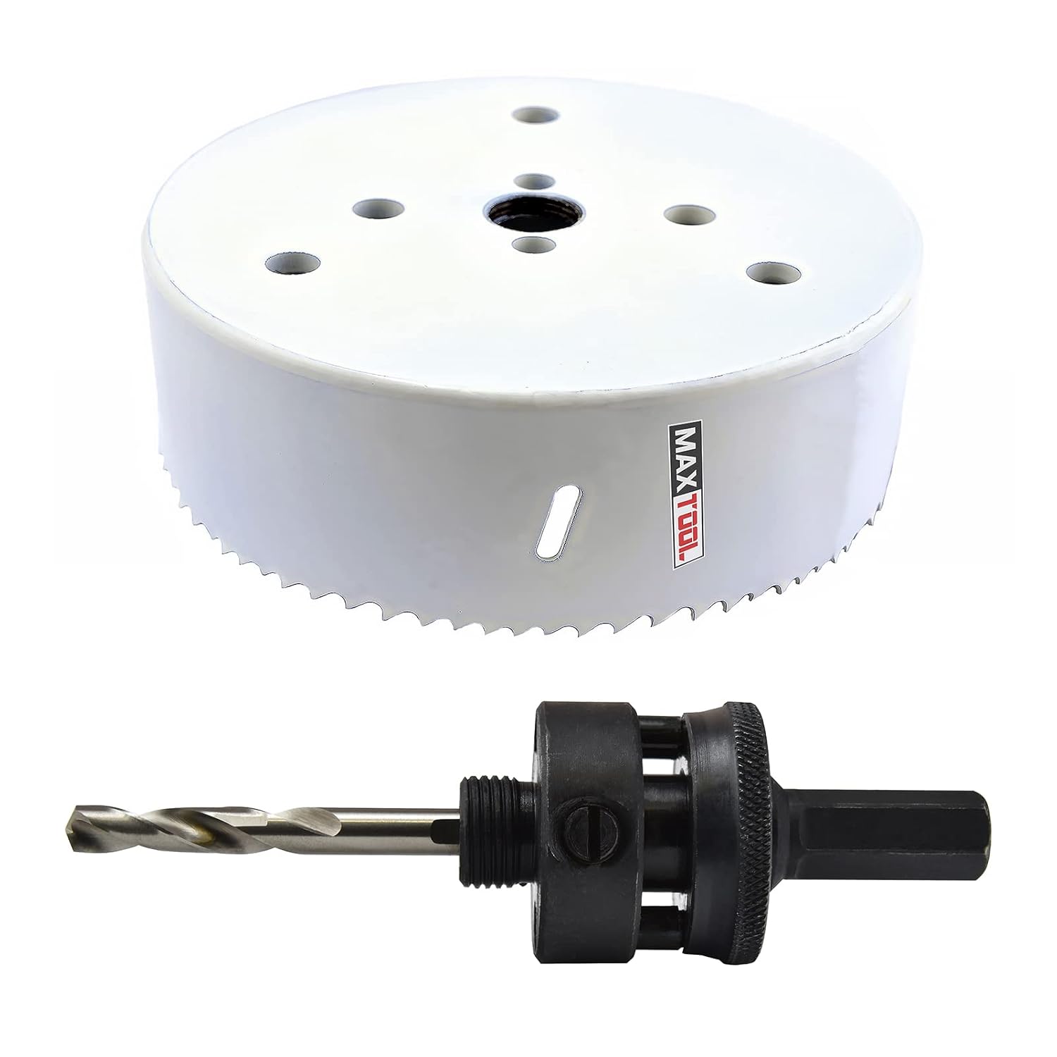 Tackle tough hole cutting projects with precision using MaxTool professional grade 6-1/4-Inch (160mm) Cobalt Bi-Metal Hole Saw kit. The set includes a robust 160mm cobalt bi-metal hole saw blade, a sturdy arbor/mandrel, and a precision ground high speed steel pilot drill - everything you need for clean, accurate holes for immediate use. MaxTool professional-grade hole saw features M42 cobalt high speed steel construction with vacuum-hardened teeth in a 4/6 varied pattern, designed for superior cutting performance and durability when cutting multiple roughest materials. The cobalt bi-metal combines durability with excellent heat resistance, allowing for efficient cutting action and extended use. The innovative 4/6 varied teeth design optimize cutting efficiency, reduce vibration and promote smoother cutting application. The vacuum-furnace hardened teeth maintain their edges outstanding sharp, perfect wear resistance and a tendency to stay sharper. 1.5-inch cut-depth provides versatile hole-making capability in one pass for wide applications. With 7/16” hex standard arbor or mandrel, this hole saw integrates seamlessly with most of chucks and drilling systems, provides large torque, allows for fast blade changes while maintaining secure attachment during heavy duty applications. Multiple Knock-Out slots are for removing core easily. Thicker hardened wall and back prevent warping. The pilot drill ensures accurate hole placement and prevents wandering when starting your cut. Each set comes securely packaged in a rigid protective coded box for safe storage, transport, easy identification. The sturdy construction and precise grinding make this versatile set the best choice for contractors, DIY enthusiasts and professional craftsmen, while working on construction, maintenance, such as home improvements, remodeling, manufacturing, electrical, plumbing, and other professional applications. The substantial large diameter makes it perfect for large-size hole applications。