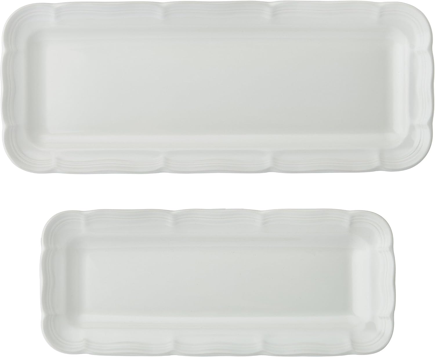 Eye-catching curves grace this French Countryside Set of 2 Bread Trays by Mikasa. Beautifully crafted from high-quality stoneware for long-lasting beauty and durability, these contemporary and stylish rectangular trays elevate your table setting with contemporary, scalloped edges, and nest for compact storage. Set of 2 trays includes 1 large bread tray measuring 15 inches long by 6 inches wide, and 1 small bread tray measuring 12 inches long by 5 inches wide. Microwave and dishwasher safe.