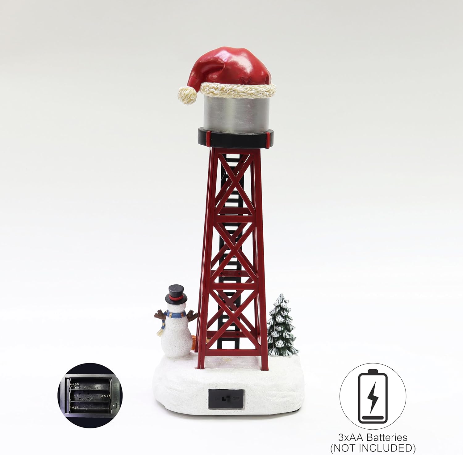Elevate your holiday display with the Moments in Time 12-inch LED Lighted Christmas Village Water Tower, a charming addition that captures the joy and warmth of the season. This beautifully crafted polyresin decoration features a tall red water tower topped with a Santa hat and a "Merry Christmas" sign that instantly brings festive cheer to your home. The tower’s structure glows with colorful LED lights that illuminate your Christmas village scene with a magical, inviting ambiance. At the snowy base, a cheerful snowman wearing a blue scarf stands beside a playful squirrel holding an acorn, adding a touch of whimsy to your winter display. A small Christmas tree completes the scene, dusted with glitter for that perfect frosty sparkle. This lighted holiday decoration is battery operated, giving you the flexibility to place it anywhere in your home without the hassle of cords or outlets. Simply insert 3 AA batteries (not included) and watch as your holiday village comes to life with radiant color and warmth. Packaged beautifully in Moments in Time gift-wrap packaging, it also makes an excellent holiday gift for friends, family, or collectors of Christmas village decor. Create a festive atmosphere that delights both children and adults and make this Santa Hat Merry Christmas Water Tower the highlight of your seasonal display. Dimensions: 5.2” x 4.13” x 11.93” Weight: 1.01 lbs