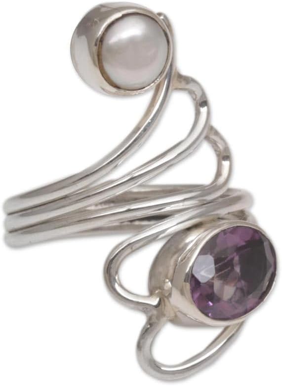 Novica works together with talented artists, artisans, and designers around the world to produce stunning, keepsake handmade treasures. Our mantra is to Spread Happiness, so rest assured - we’ll do everything we possibly can to ensure you’re a happy customer!About this item: Set in an airy heart, amethyst, the birthstone of February, sparkles with violet light. Complemented by a luminous cultured pearl, this enchanting design swirls around the finger with grace and beauty. Wayan Sarjana creates a handmade rings with a plea to mankind's noble sentiments. Amethyst represents a connection with spirituality while pearls are a symbol of a pure heart and mind....