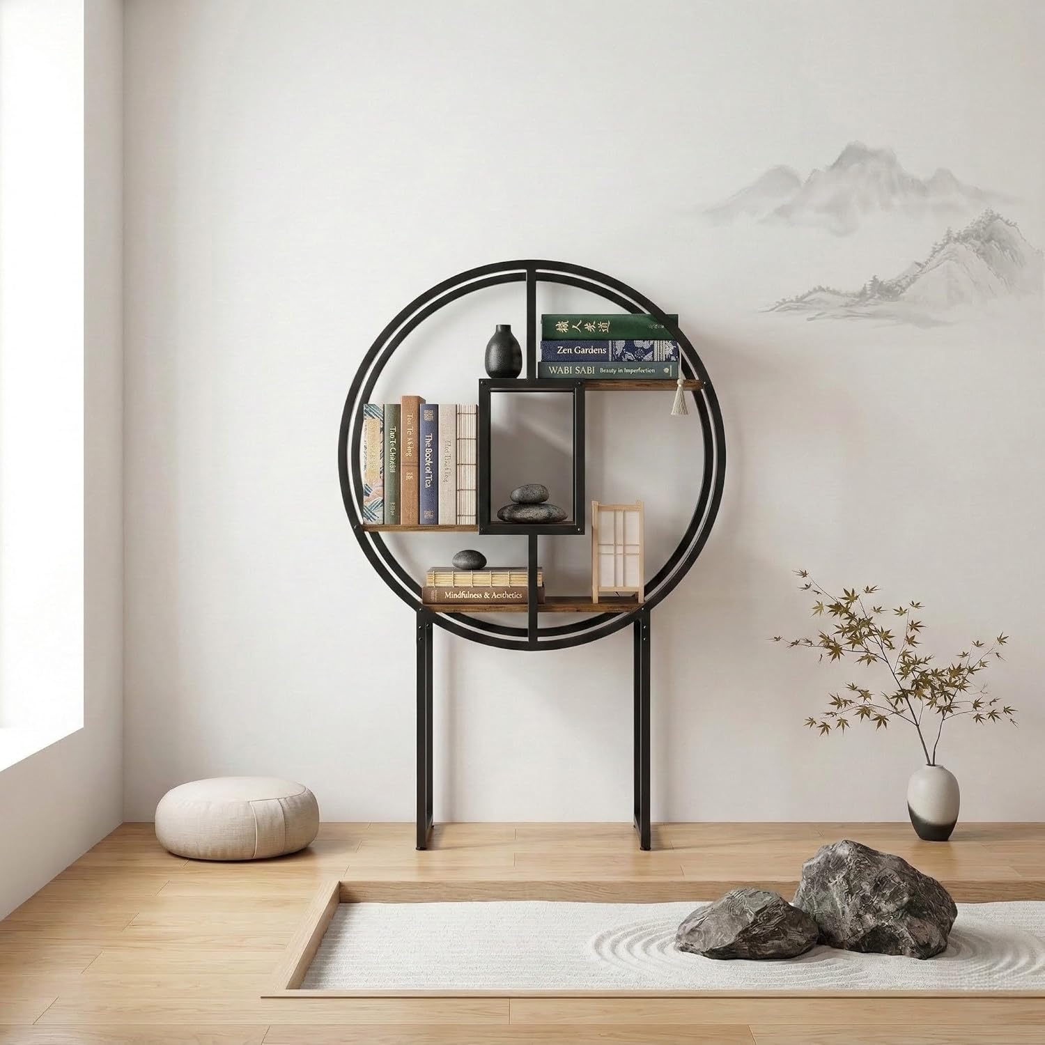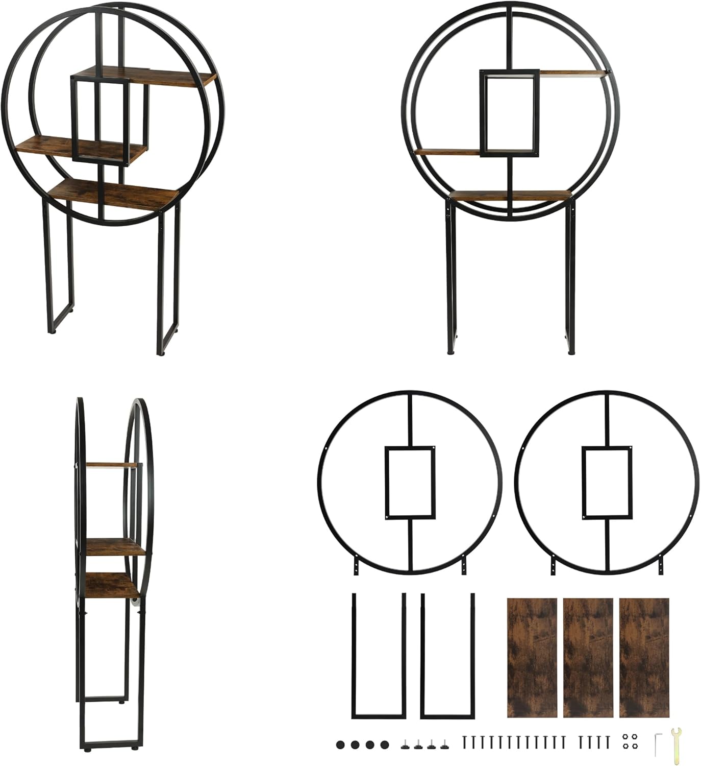 Industrial Round Bookshelf 51" – Modern Circular Etagere Bookcase with Geometric Shelves. This freestanding open display shelf acts as a striking circle bookcase for your living room, home office, & decor. Featuring rustic brown wood and a black metal frame in a unique moon shape, this round book shelf is the ultimate statement piece for organizing your favorite books, plants, and collectibles.